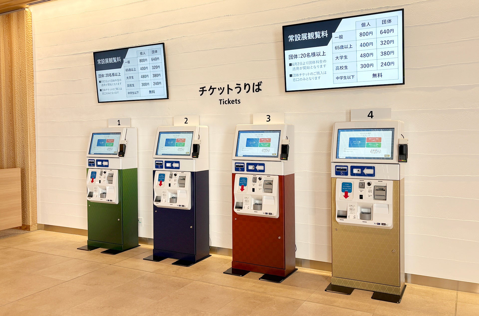 1Fエントランスホールに設置された「マル券くん」。日本の伝統色と文様をラッピングに取り入れている