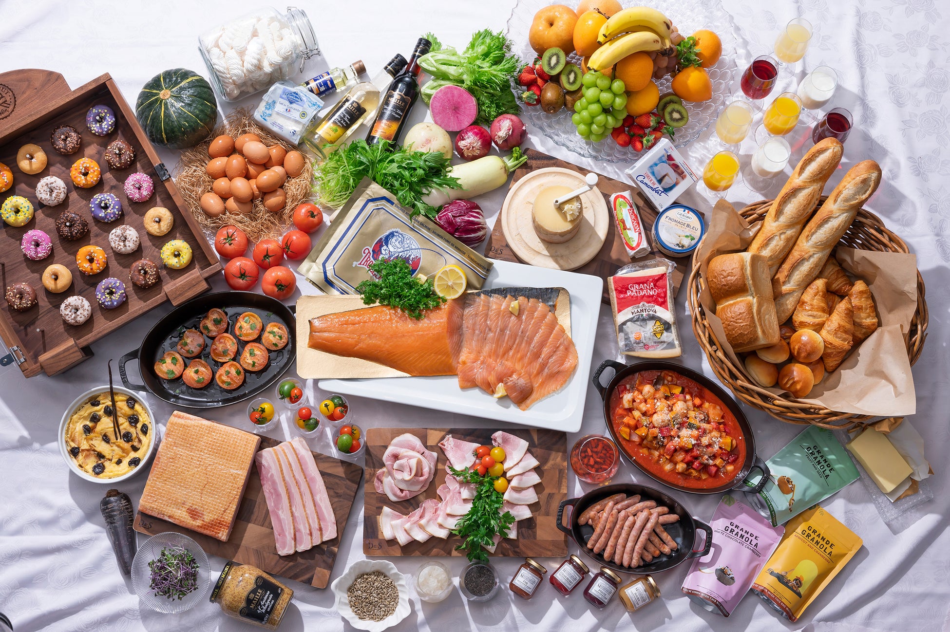色鮮やかなフレッシュサラダや、フランス「MAILLE」の調味料、種類豊富なブレッド&スーパーフードをご用意。さらに、瀬戸内海産の焼き魚や備前味噌のお味噌汁が並ぶ和食コーナー、地元・美星町産の豚珍甘ソーセージのグリルなど、岡山の恵みを存分に味わえる充実したメニューをお好きなだけお楽しみください。