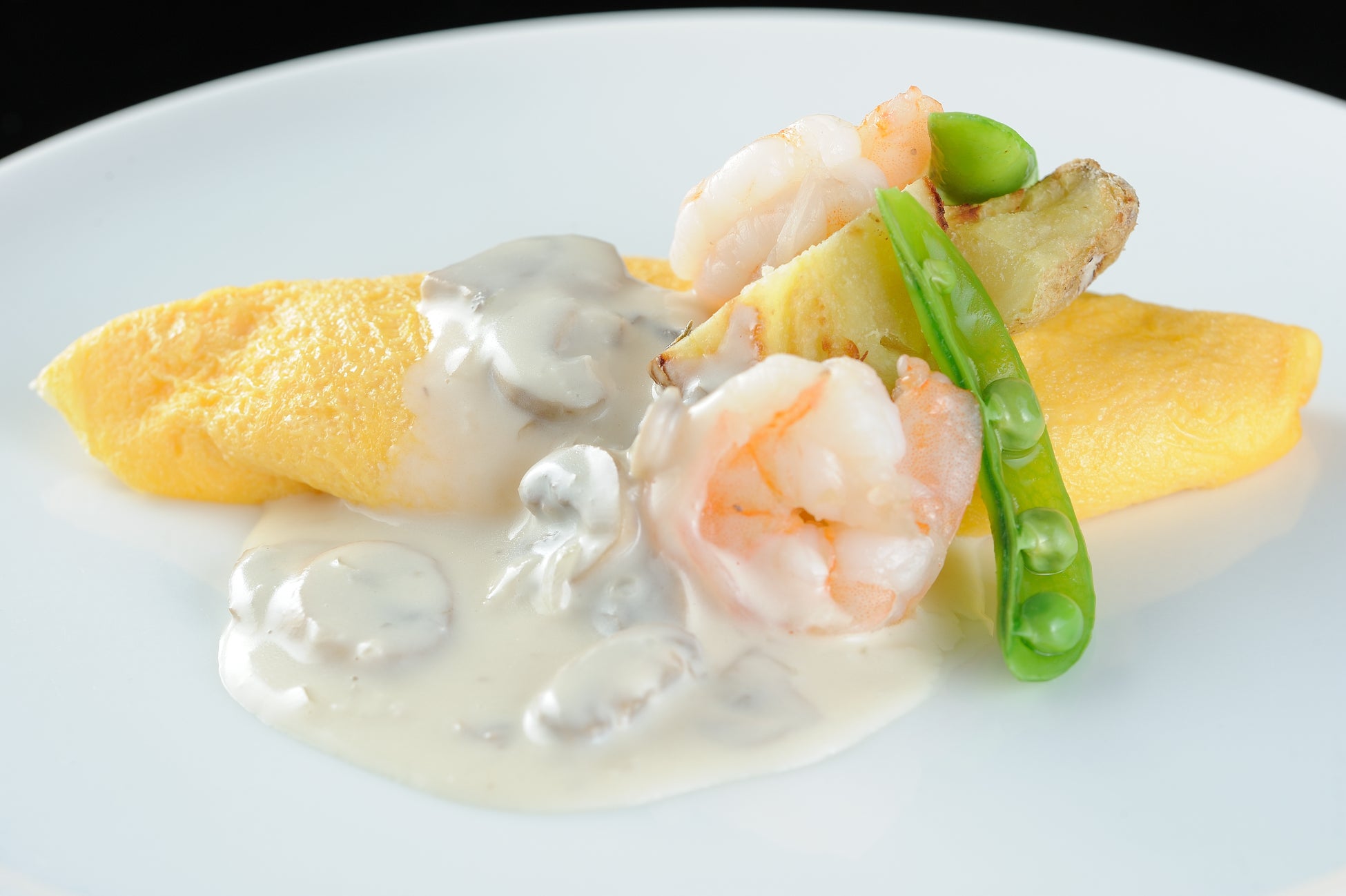 「美星町産星の里たまごのオムレツ 牛窓産マッシュルームと小海老のクリームソース」「美星 三元 豚珍甘ロース肉“おかやまハレロースハム”と紫野菜のエッグベネディクト」「蒜山ジャージー牛乳とバゲットのフレンチトースト バニラの香りと共に」など、5種類からお好みのメイン料理をお一つお選びいただけます。