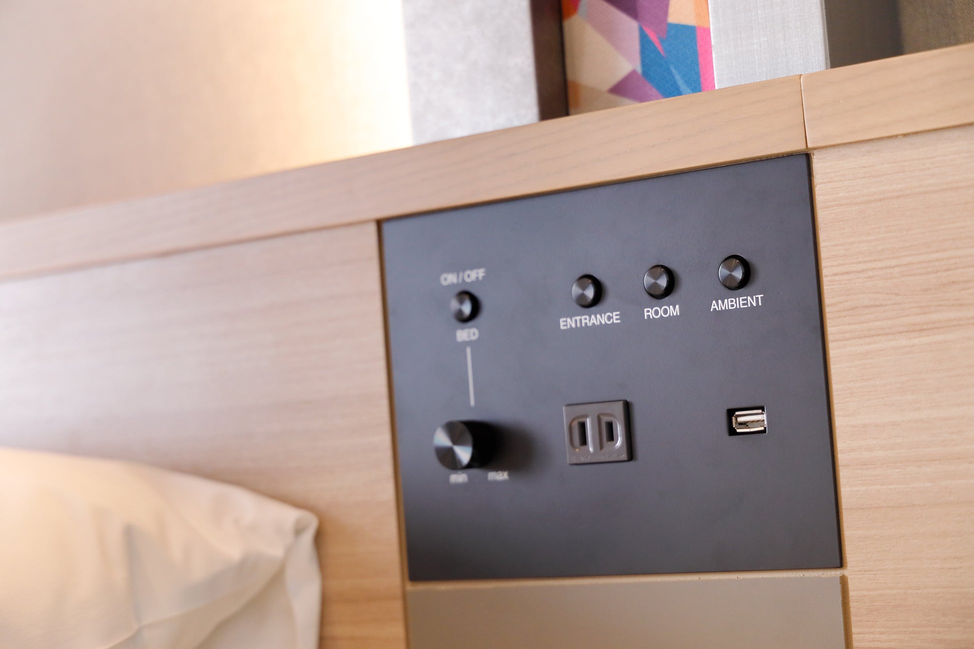 ベッドにはシモンズ社製マットレスを採用し、上質な眠りをサポートします。加えて、ベッドサイドにはUSBポートを集約させたコントロールパネルを設置。枕元で電子機器の充電や照明の操作ができ、快適で機能的な滞在を実現いたします。
