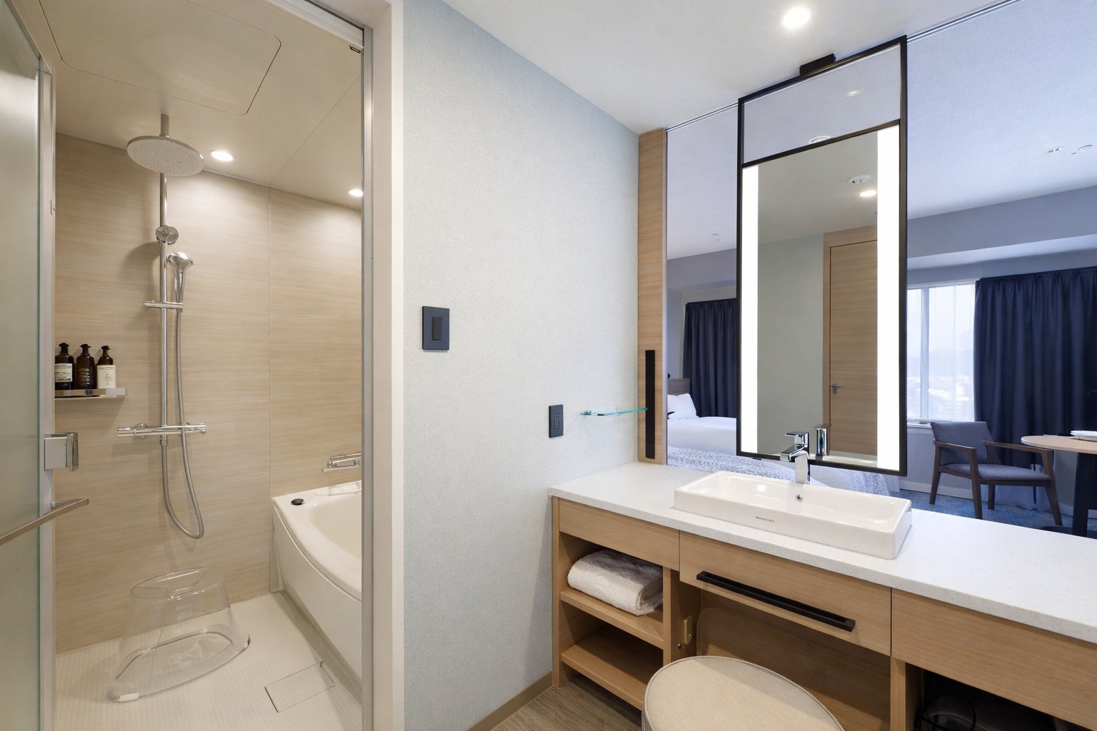 よりプライベートで快適な空間をお過ごしいただけるよう、レインシャワーを完備いたしました。バス・トイレはセパレートタイプに改修し、小さなお子様連れでも安心してゆったりとバスタイムをお楽しみいただけます。広々とした洗面台エリアは可動式の仕切り扉でプライバシーに配慮しつつ、開放時には快適な空間が広がります。