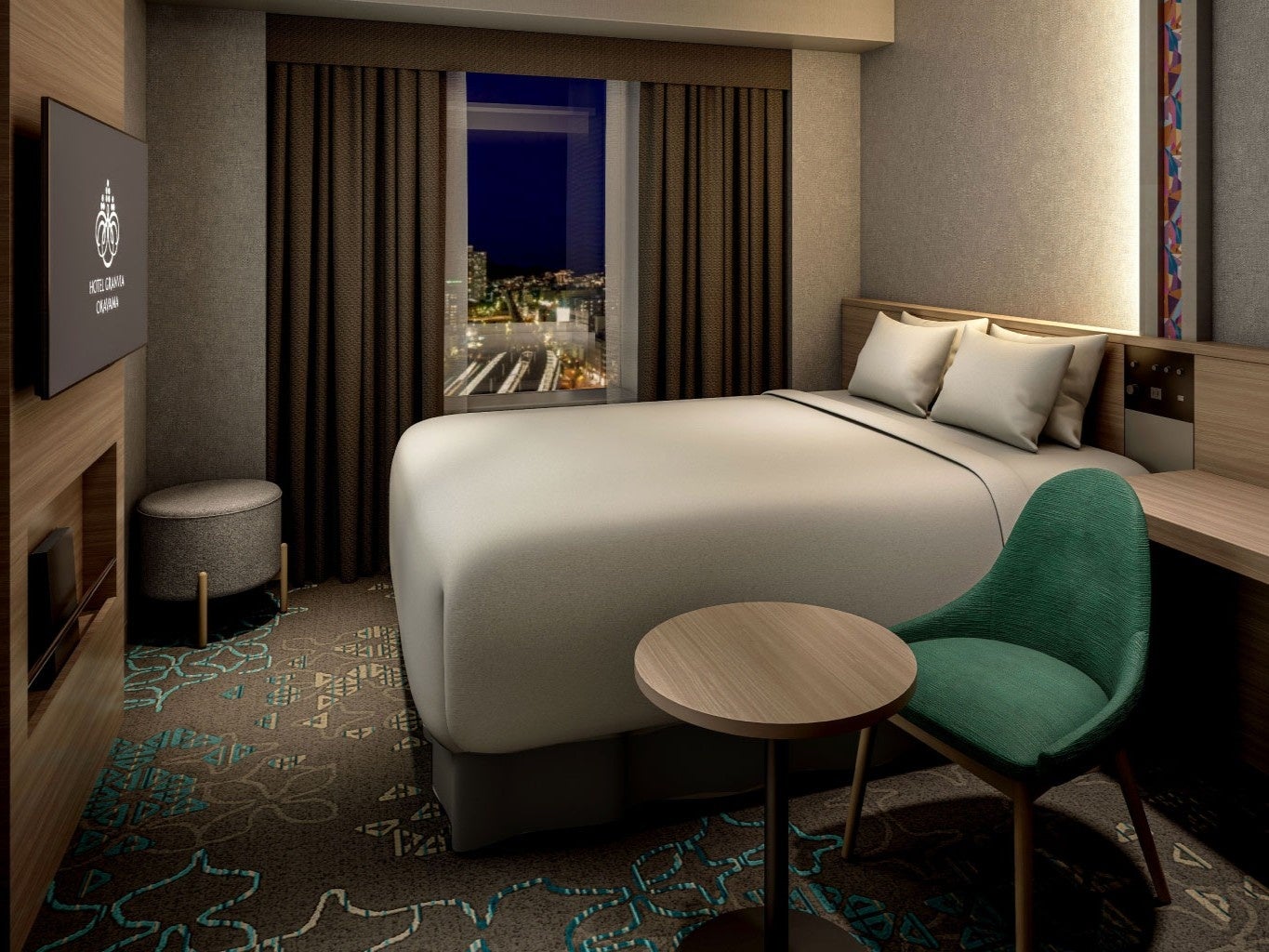 コンパクトダブルルームには、クイーンサイズのベッドを設置。ゆったりとした睡眠環境を確保するとともに、ワークデスクの導入により、出張やワーケーションなどビジネス利用のお客様にも使いやすい仕様に。