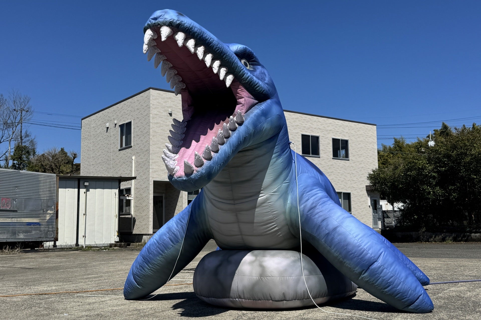 2026年3月にリリースしたばかりの新商品です。夏の屋外イベントで大活躍する大人気の「恐竜ミストバルーン」シリーズに、海の王者・モササウルスが仲間入りしました。迫力満点の巨大な口から涼しいミストを噴射し、来場者の目を惹きつけながら熱中症対策としても効果を発揮します。