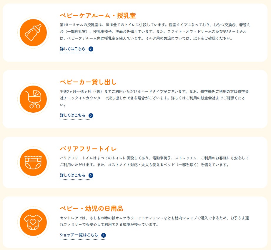 また、同ページ内で各店舗へのベビーカーの持ち込み可否やお子様向け食器の貸し出しの有無などをまとめたリストや空港内のベビーケアルーム・授乳室、バリアフリートイレなどの設備・サービス情報も掲載しており、親御さんも一目で必要な情報がわかる内容となっています。