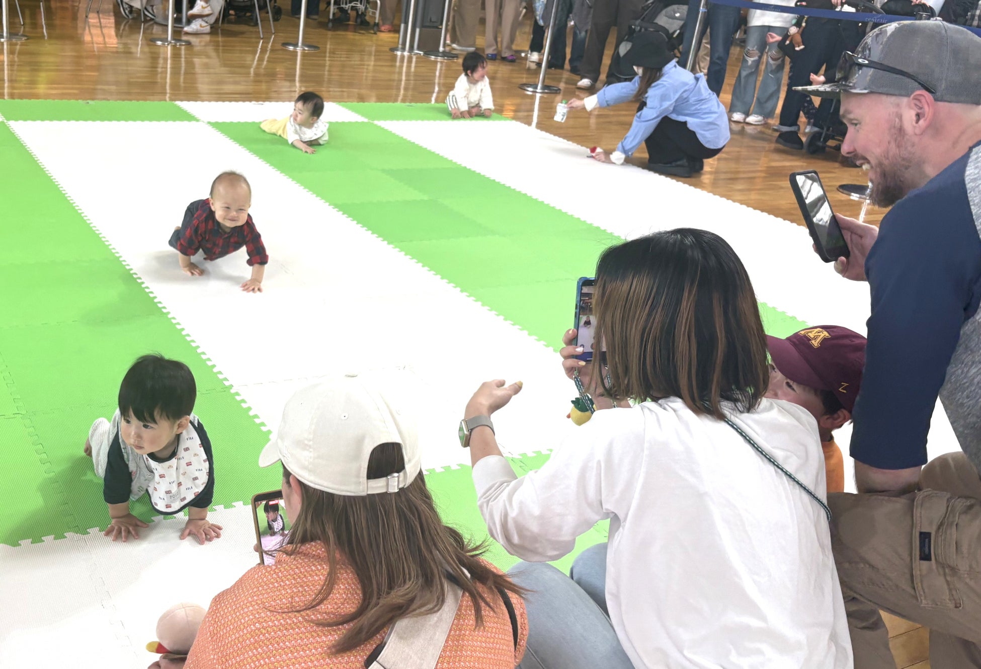 レース時間は1レースにつき2分間。スタート後は、パパやママが赤ちゃんに触れることはできず、ゴール側に回って声援のみで応援します。「こっちだよ!」「おいでおいで!」と必死に声を掛ける保護者の姿があちこちで見られ、会場は熱気と笑顔に包まれていました。