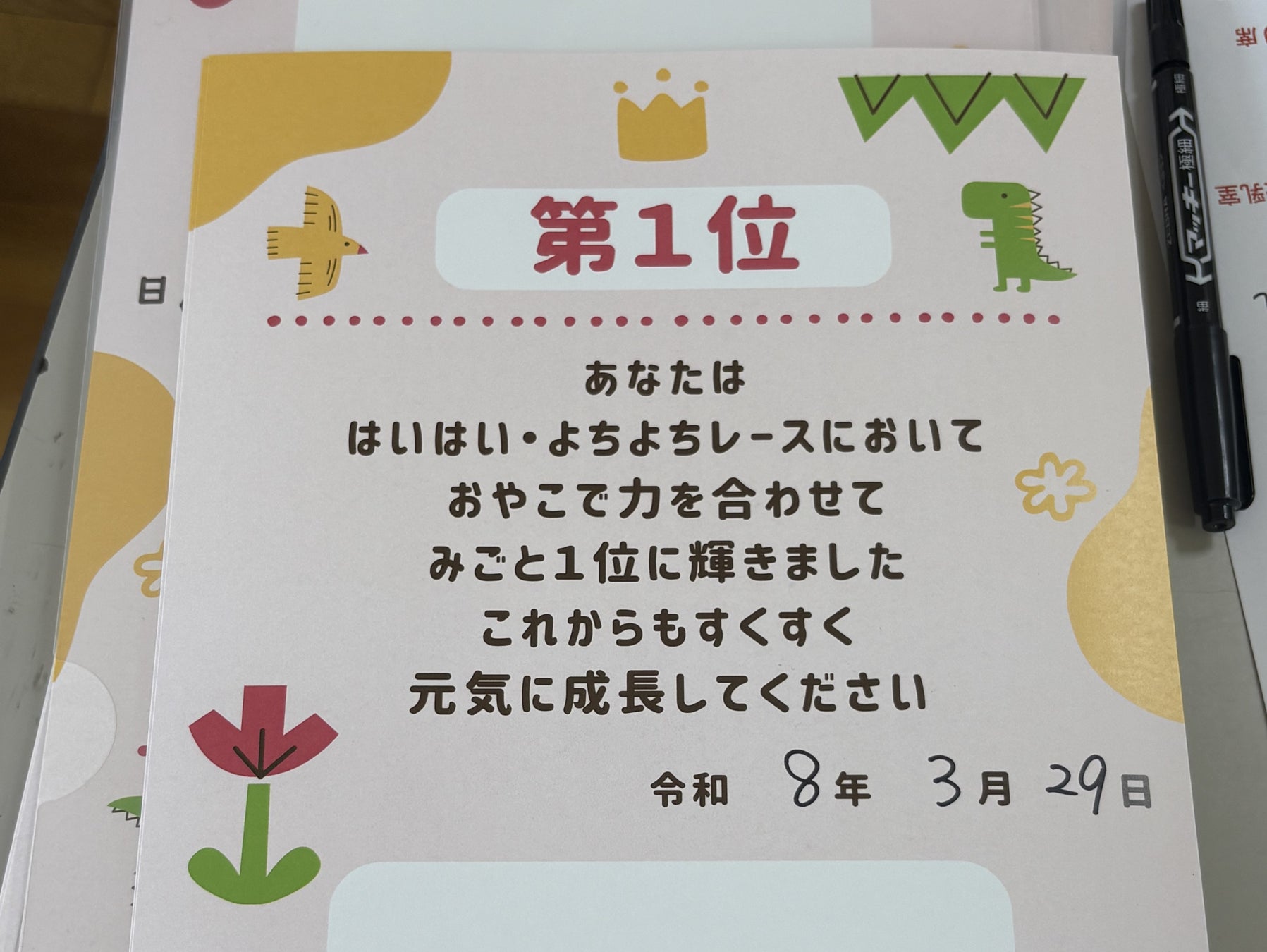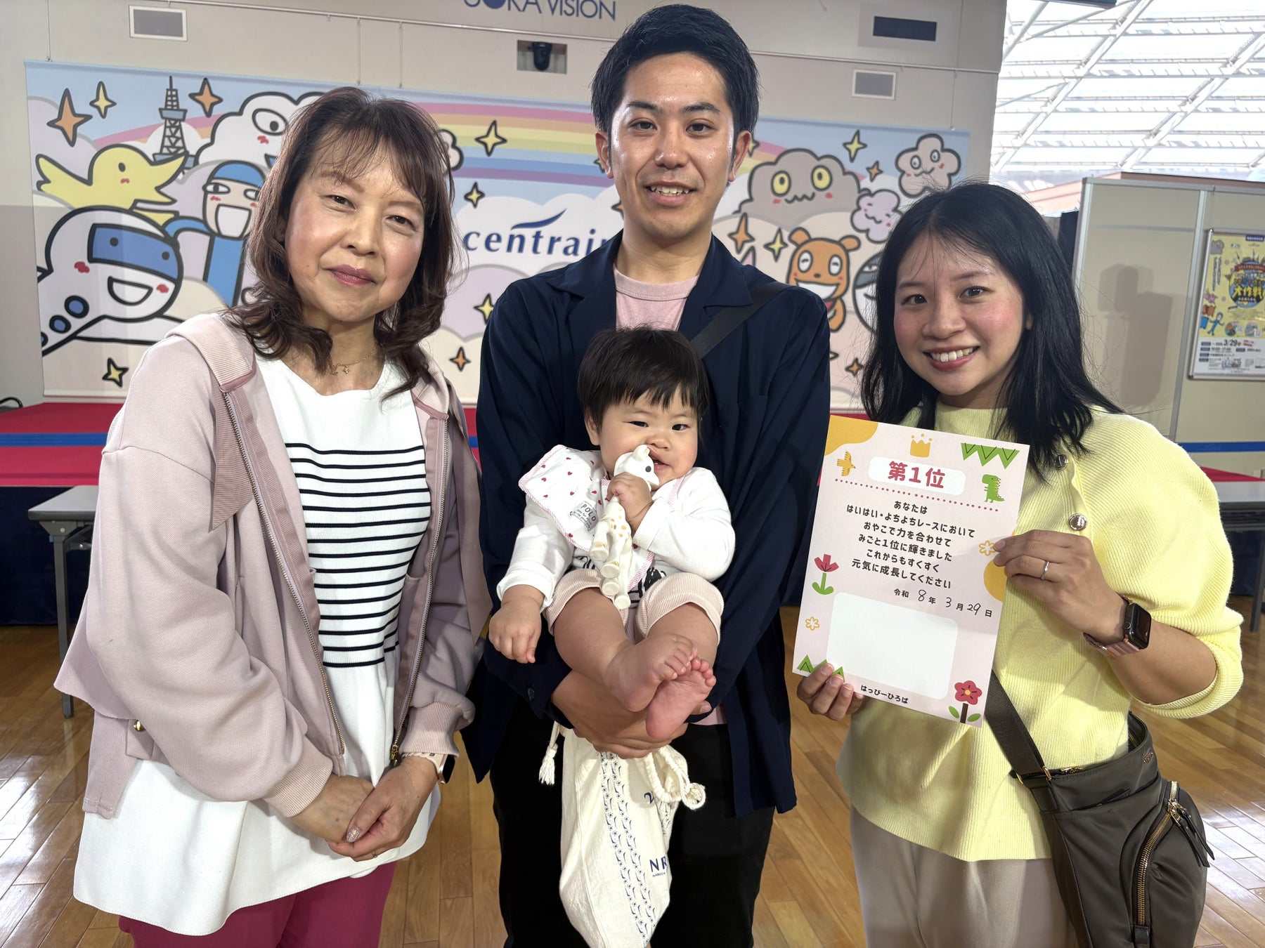 頑張ったレースの後は、1位の赤ちゃんには賞状が授与されました。また全員の赤ちゃんに参加賞として、赤ちゃん用おしりふきやミニタオル、セントレアフレンズグッズなどが当たる空くじなしの抽選を行われました。どの赤ちゃんもレースの緊張から解き放たれ、保護者に抱かれ安心して甘える姿が印象的でした。
