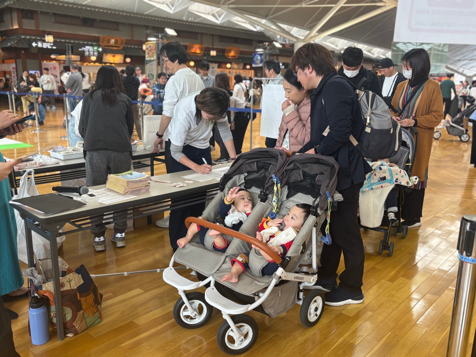 レースには、2日間で計280名の赤ちゃんが参加しました。予約時間が近づくにつれ、赤ちゃんとご家族が続々と受付に集まり、会場はにぎやかな雰囲気に包まれました。ベビーカー置き場も次第に埋まり、イベントへの注目度の高さがうかがえました。