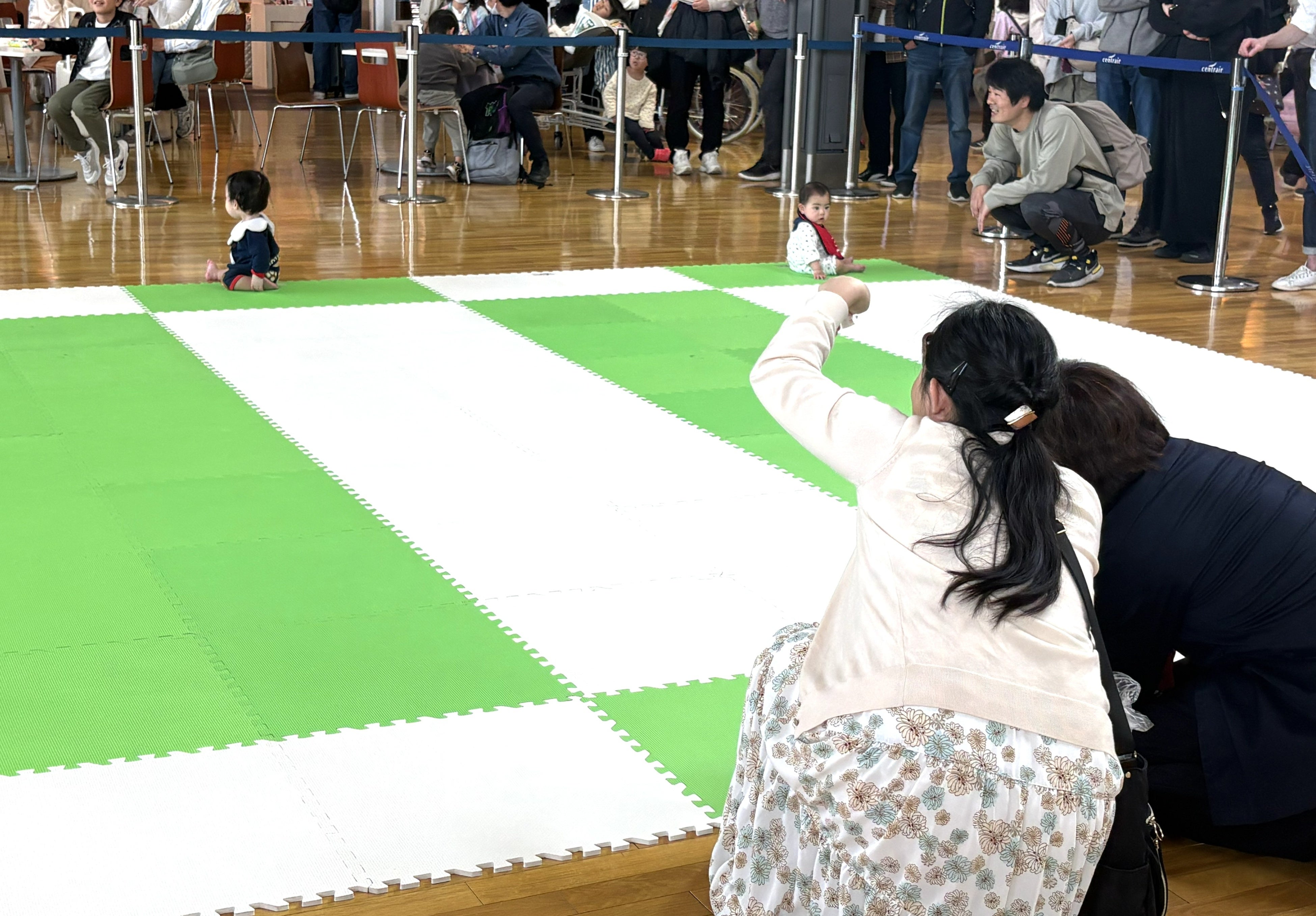 レース時間は1レースにつき2分間。スタート後は、パパやママが赤ちゃんに触れることはできず、ゴール側に回って声援のみで応援します。「こっちだよ!」「おいでおいで!」と必死に声を掛ける保護者の姿があちこちで見られ、会場は熱気と笑顔に包まれていました。