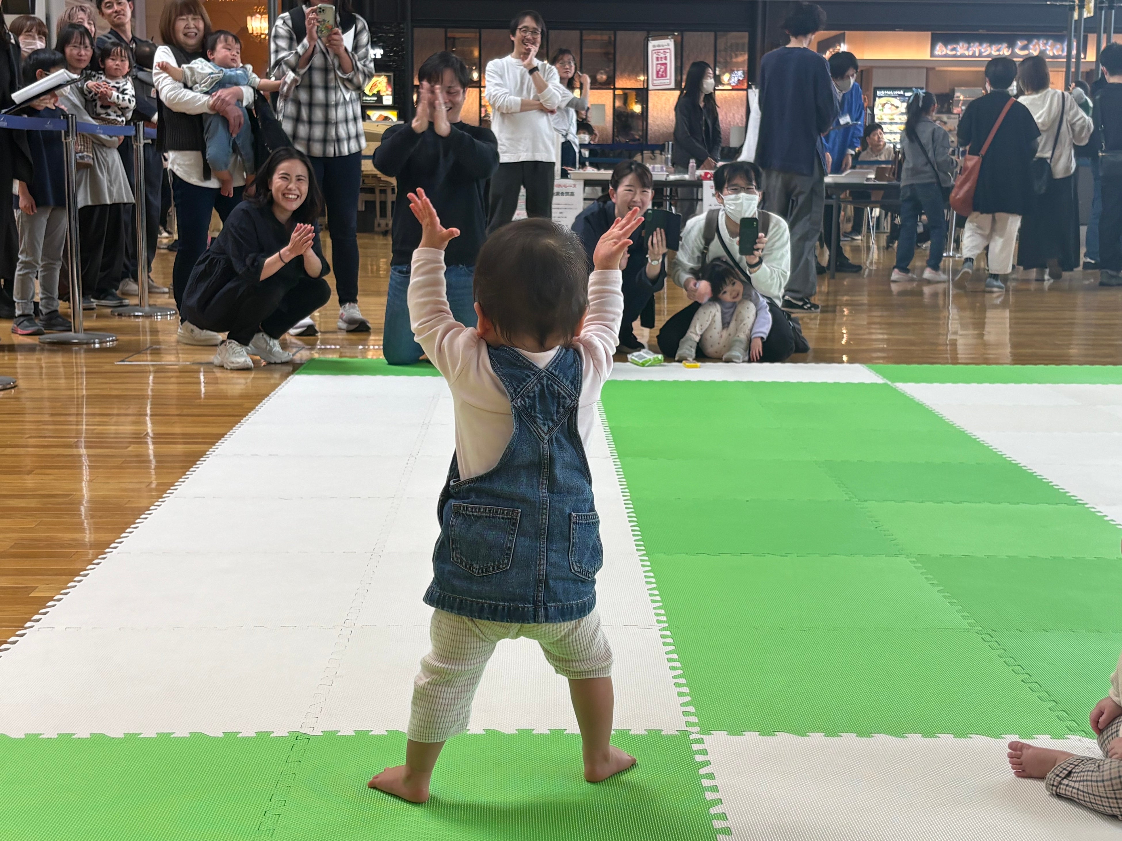 会場では、思わず立ち上がってお友だちを応援する赤ちゃんや、途中で寝転んでしまう赤ちゃん、パパやママの声援に知らんぷりを決め込む赤ちゃん、泣いてしまう赤ちゃんなど、一人ひとり個性あふれる愛らしい姿が見られました。さまざまな表情に包まれたレースは、参加者や観覧者の温かな笑顔にあふれる、何とも微笑ましいひとときとなりました。