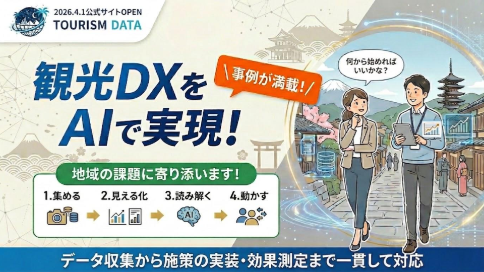 AIやデータを観光に活かすチャンス。データ収集からAI分析・開発・施策実施までワンストップ支援。自治体・DMO・宿泊施設の観光DXにおける数百件の実績から事例を紹介