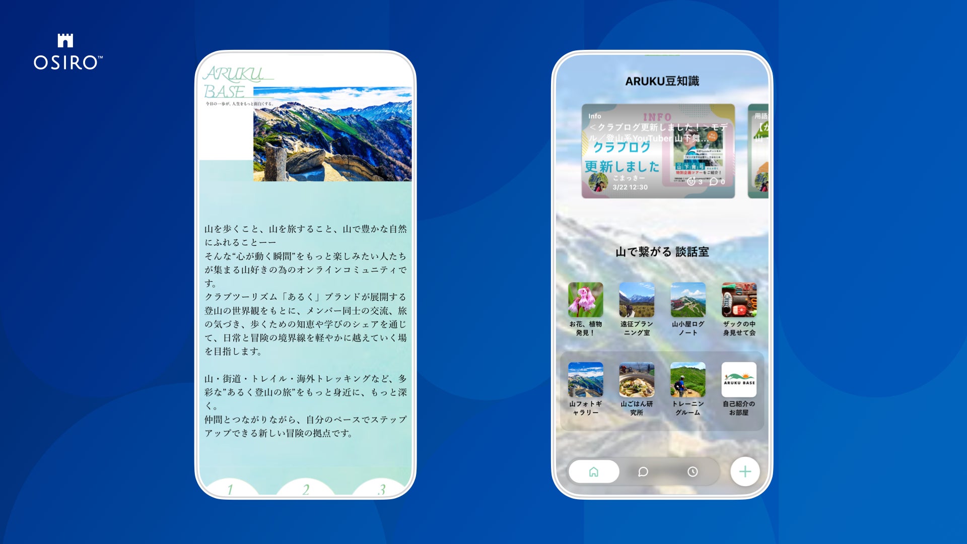 コミュニティ専用オウンドプラットフォーム「OSIRO」を提供するオシロ株式会社(所在地:東京都渋谷区、代表取締役社長:杉山博一、以下 オシロ)は、クラブツーリズム株式会社(本社:東京都江東区、代表取締役社長:酒井博、以下 クラブツーリズム)の「登山」をテーマにしたオンラインコミュニティ『ARUKU BASE(アルクベース)』にOSIROの提供を開始したことをお知らせします。