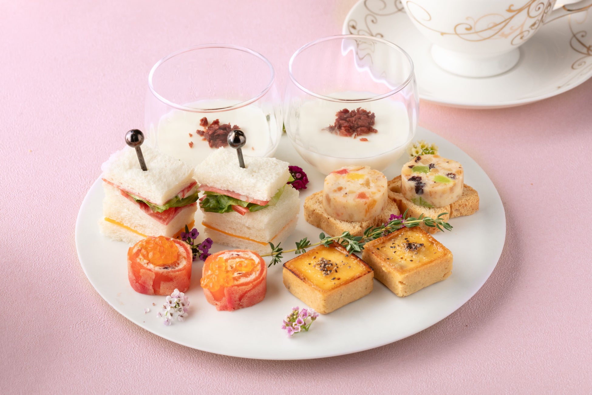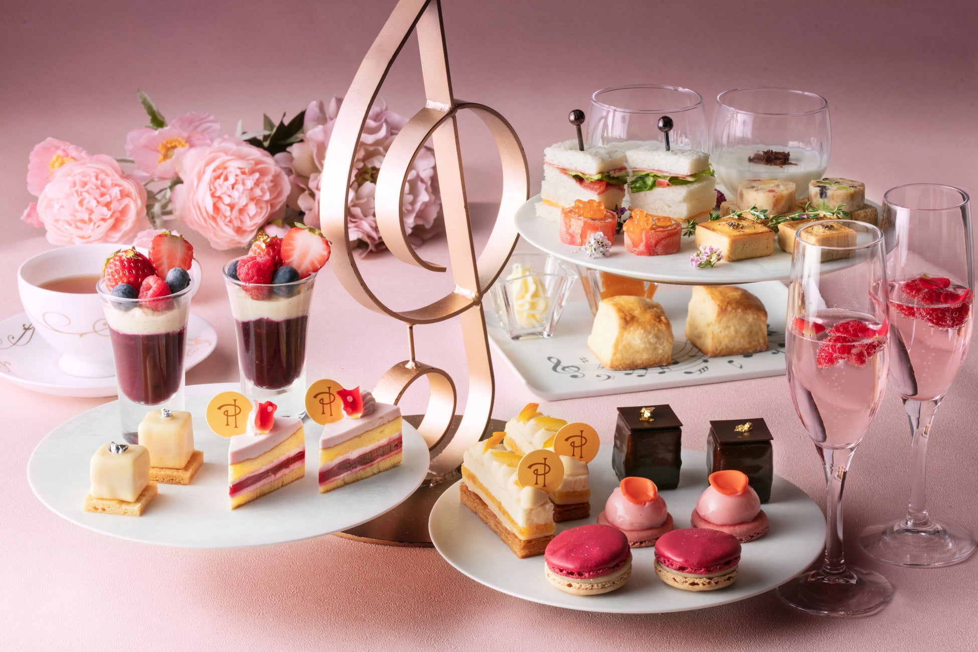 同ブランドを代表する、バラ、ライチ、フランボワーズを組み合わせたフレーバー“イスパハン”をはじめ、オレンジフラワーやスミレなど花の香りを取り入れたスイーツが並び、大切な方とのひとときや、自分へのご褒美として、心満たされるティータイムを演出いたします。ホテルシェフによるセイボリーとともに、ここでしか味わえない味覚のハーモニーをお愉しみください。