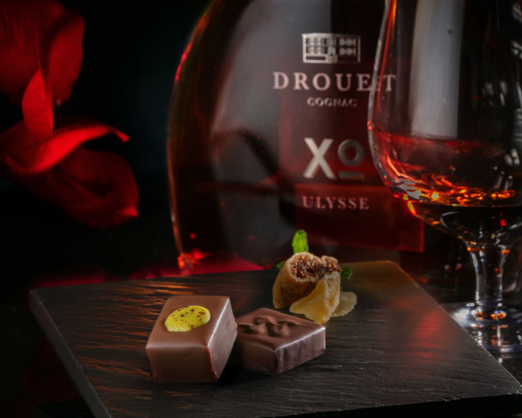 夜の時間帯には、コニャックとピエール・エルメ・パリのショコラとのペアリングを。バー限定メニューをお愉しみください。