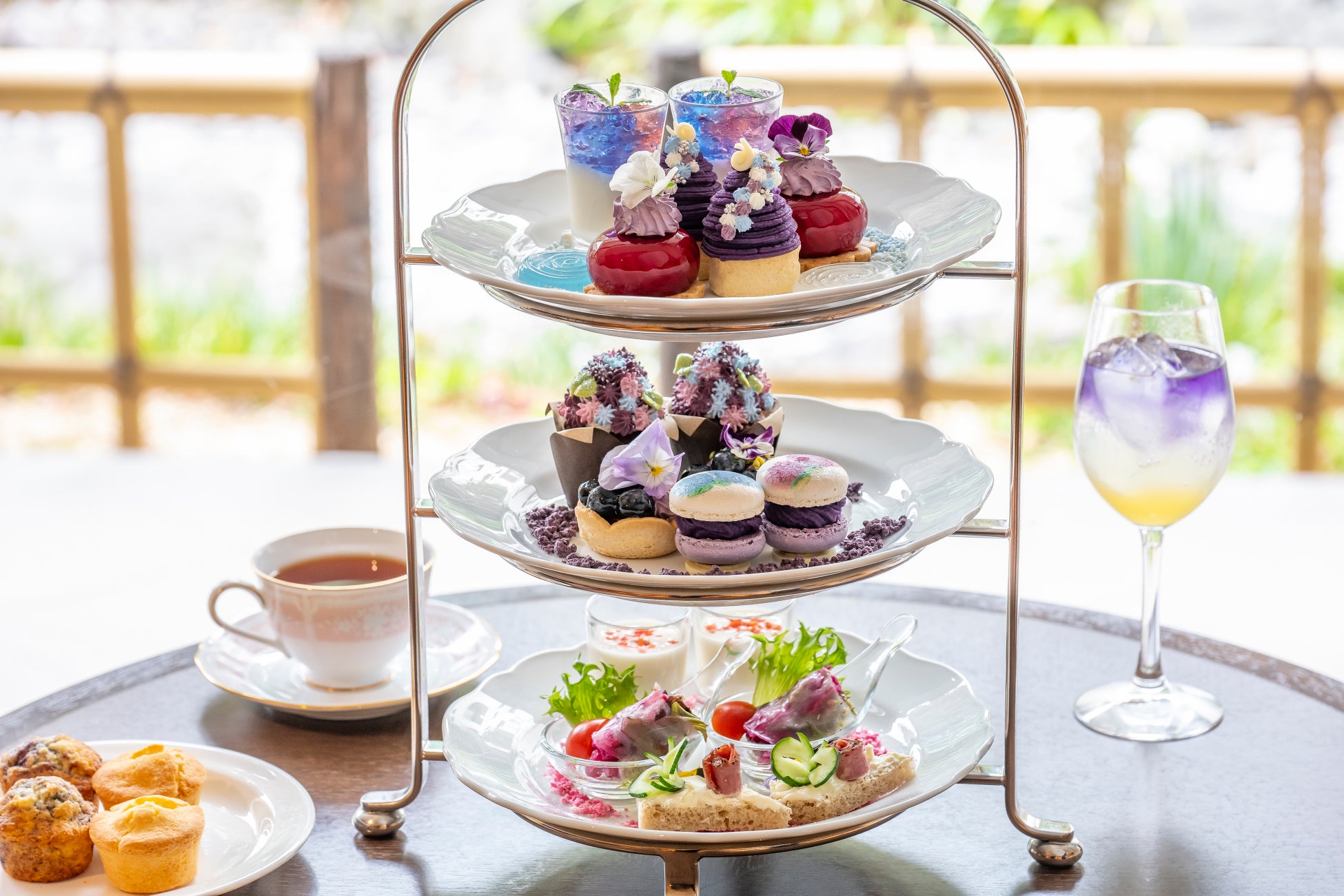 ティーサロン ピカケでは大きな窓から見える西洋あじさいの一種、「ハイドランジア」を眺めながら紫陽花の庭園をイメージした色鮮やかなアフタヌーンティーをお楽しみいただけます。
