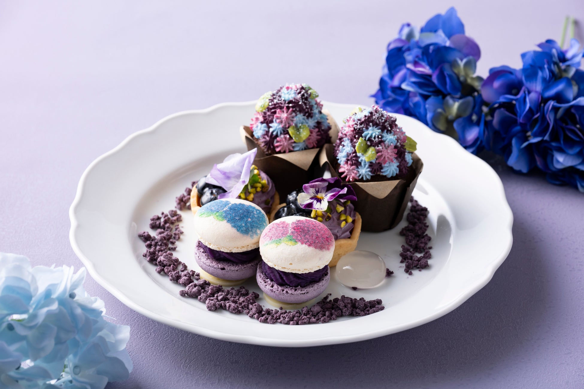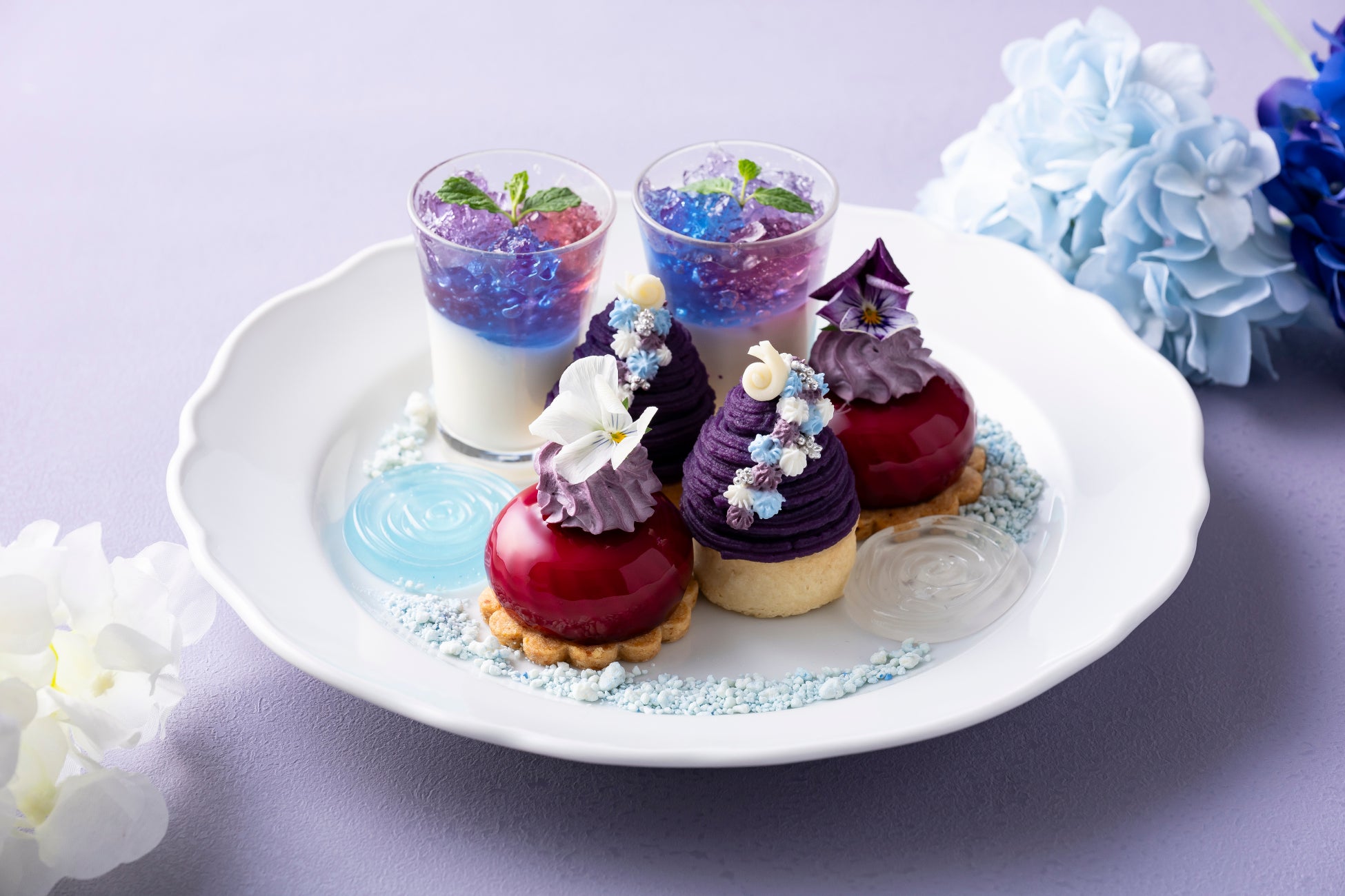 雨音に包まれるような午後のひととき、窓辺から望む紫陽花とともに梅雨の彩りを映した紫陽花アフタヌーンティーでゆったりとしたひとときをお過ごしいただけます。