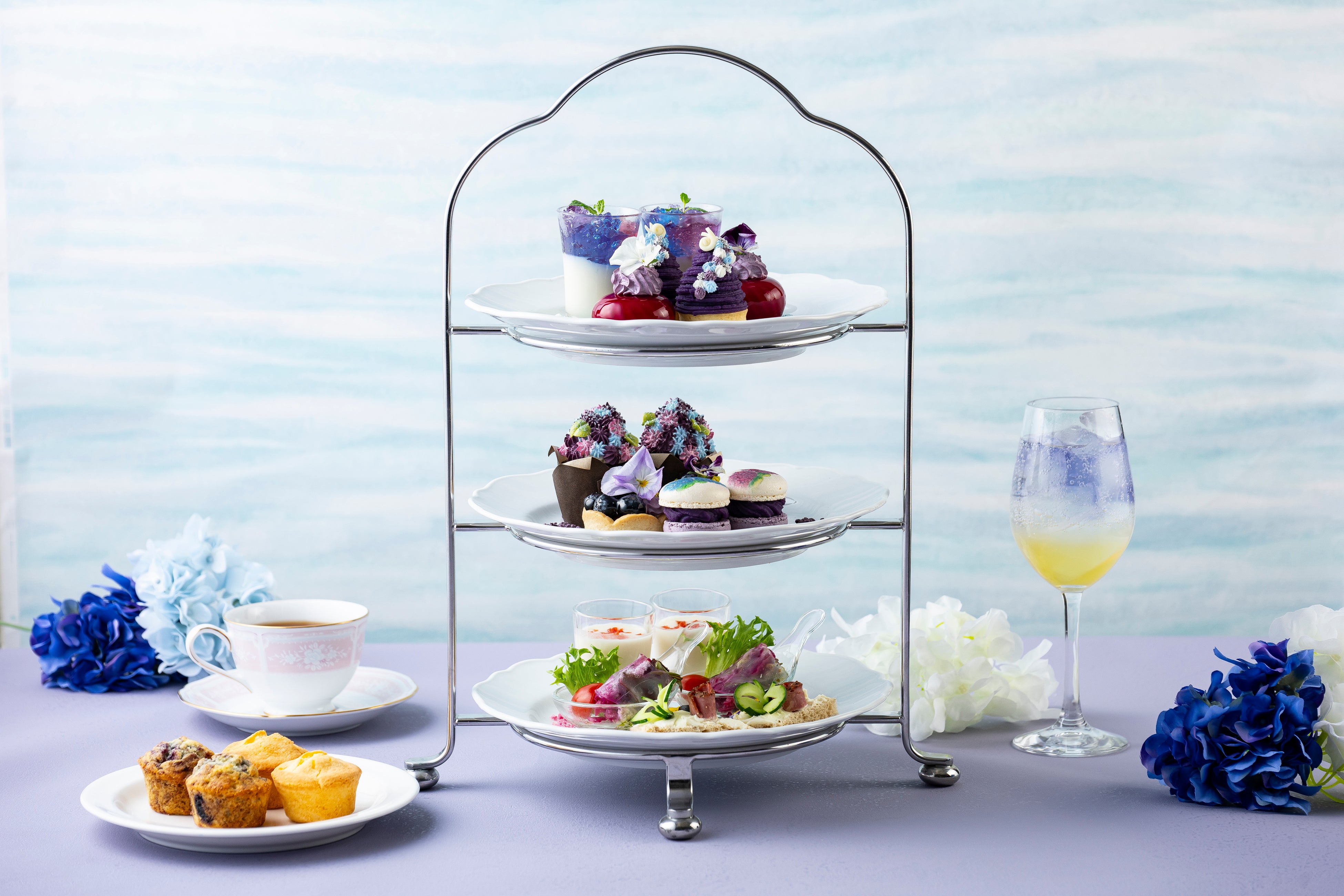 雨音に包まれるような午後のひととき、窓辺から望む紫陽花とともに梅雨の彩りを映した紫陽花アフタヌーンティーでゆったりとしたひとときをお過ごしいただけます。