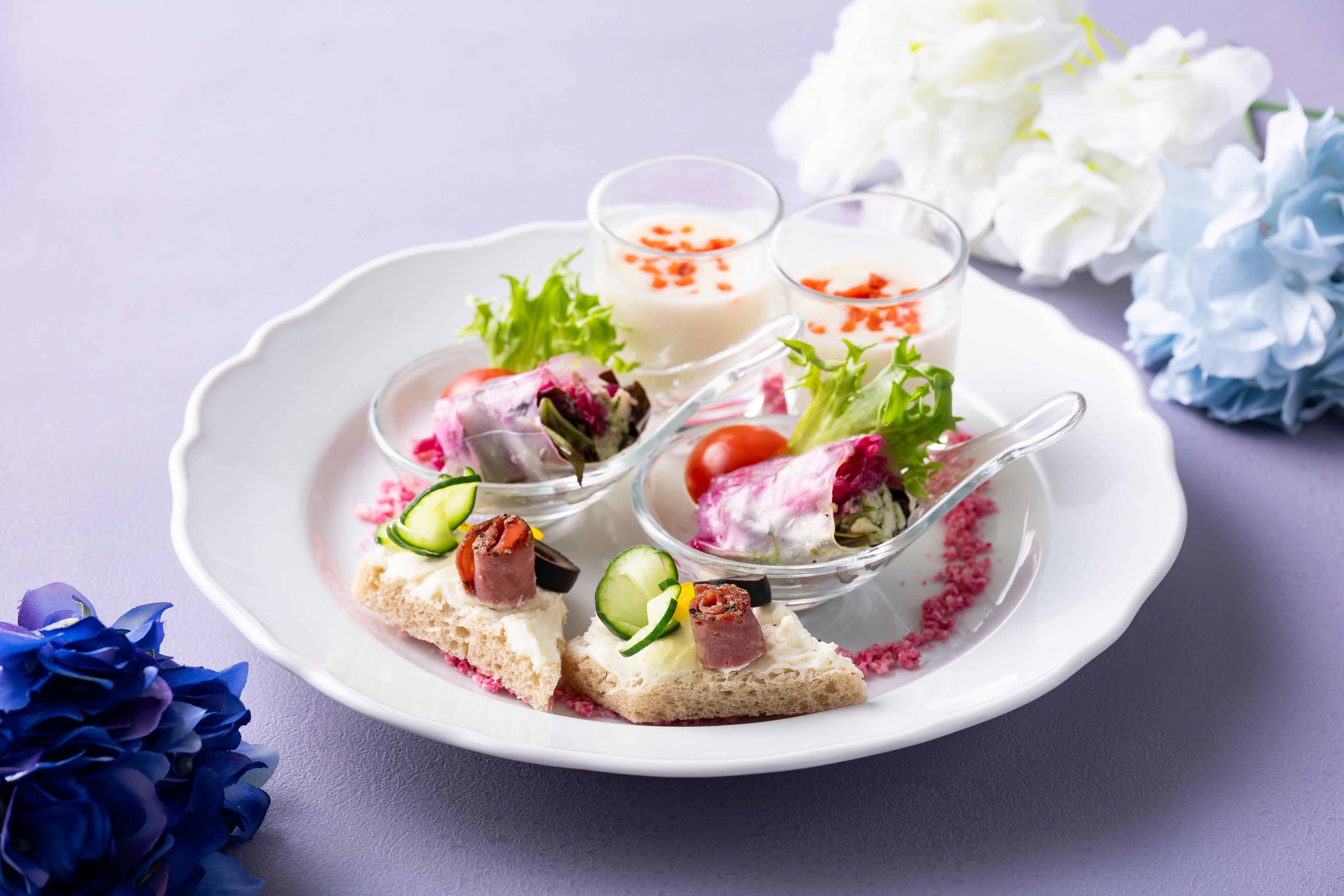 三段目のセイボリーには花畑のように彩ったクリームチーズのオープンサンドやヴィシソワーズにスモークサーモンのクリスピーを散らし赤い紫陽花を表現したスープなど、味わいにアクセントを添えるメニューを取り揃えました。