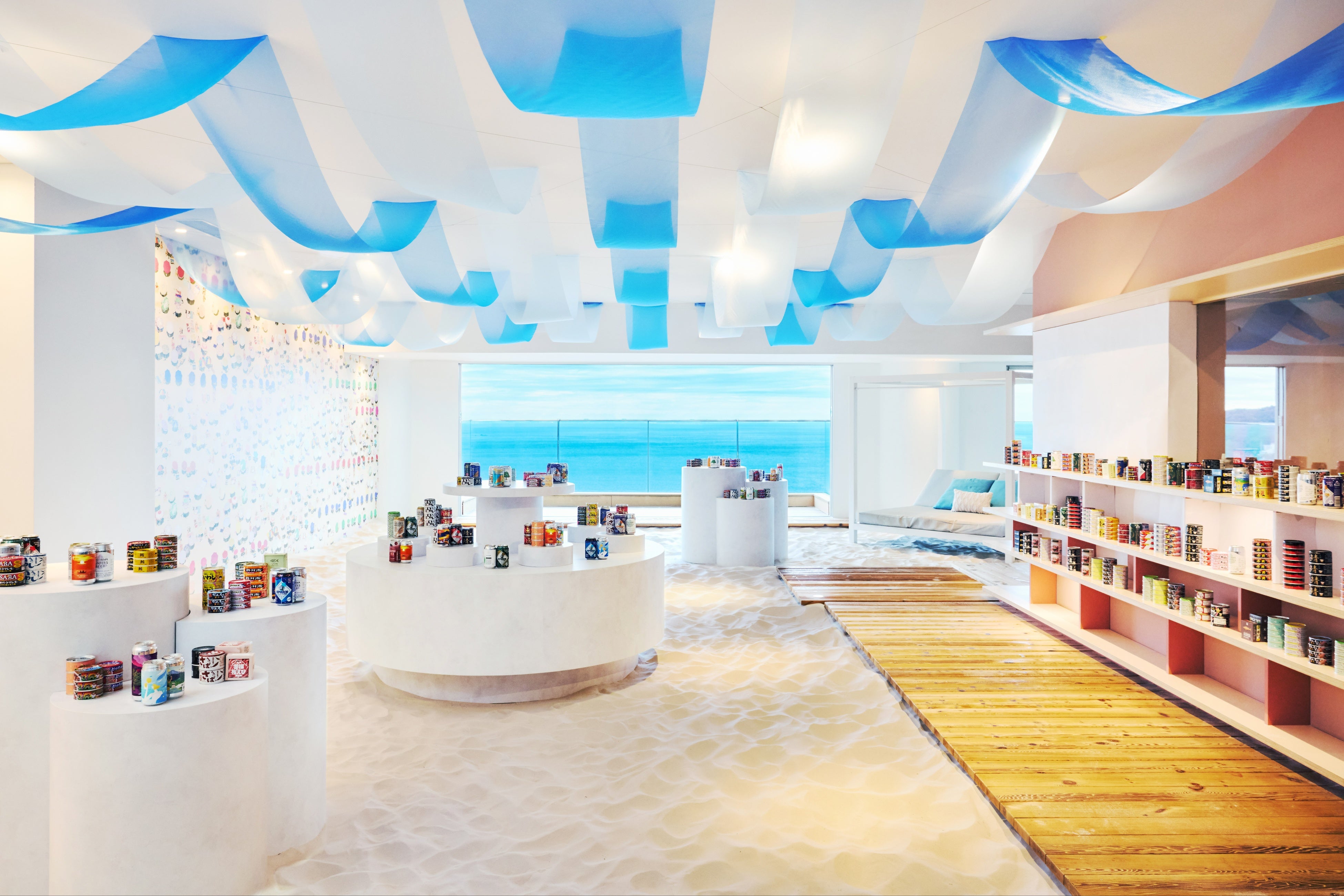 相模湾と熱海の街を望むソラノビーチ Books&Cafeに、缶をモチーフにした円形の棚や爽やかな色合いの装飾が新登場。棚にはツナ缶をはじめとした魚介系から、おでんなどの変わり種まで、静岡県を中心に作られたビールに合う缶詰100種が並びます。 開放感あふれる空間で、缶詰を自由に手に取りながら、お気に入りを探すことができます。