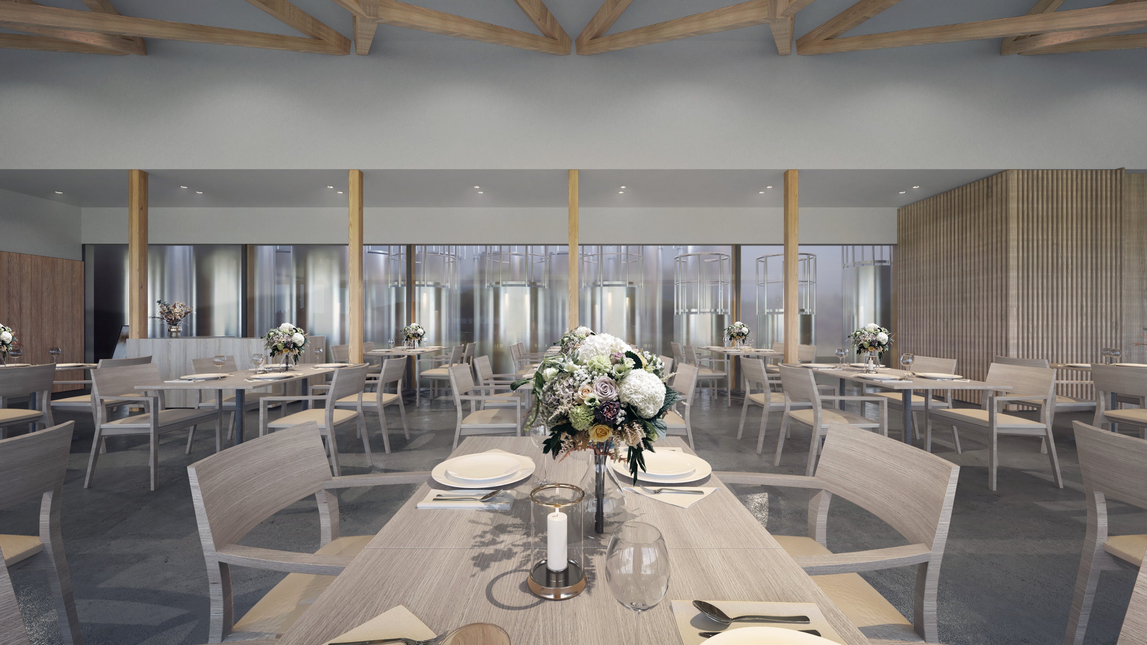 大きなガラス越しにワインの醸造工程を眺めながら、五島食材を使った料理とワインを楽しめる設計