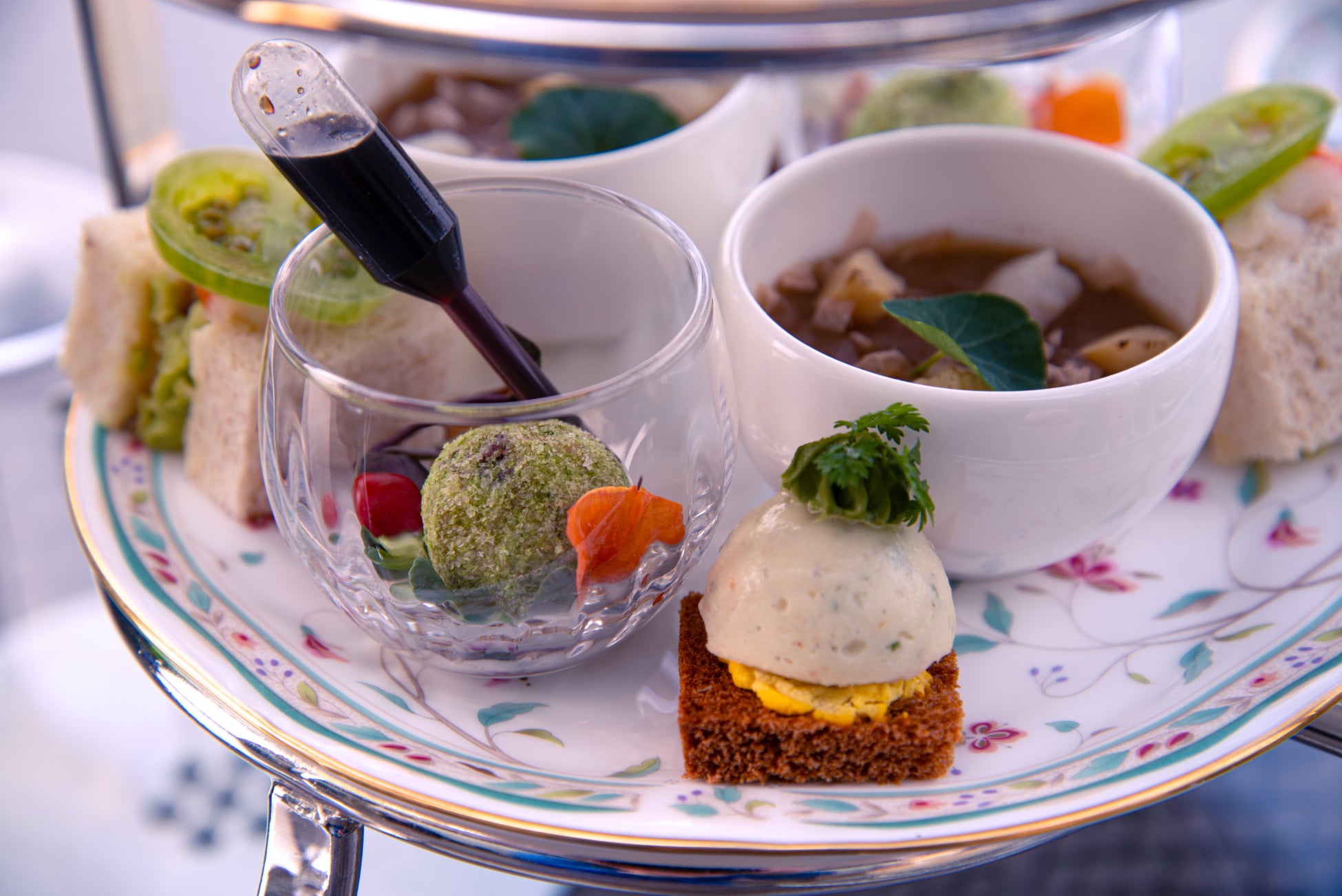 庭園の木々や花々のように、季節ごとに表情を変えるオードブルスタンドのお料理。5月~6月末には、「ずわい蟹と白アスパラガスのピュレ」や「鮎のミルフィーユ ルッコラソース」など、初夏の爽やかさを感じるメニューをご用意します。7月〜8月中旬には「焼き茄子とアンチョビのクロスティーニ」や「真蛸の炙り フェンネルコンフィ」など、旬の食材を活かした料理が登場。訪れるたびに新しい味わいをお楽しみいただけます。