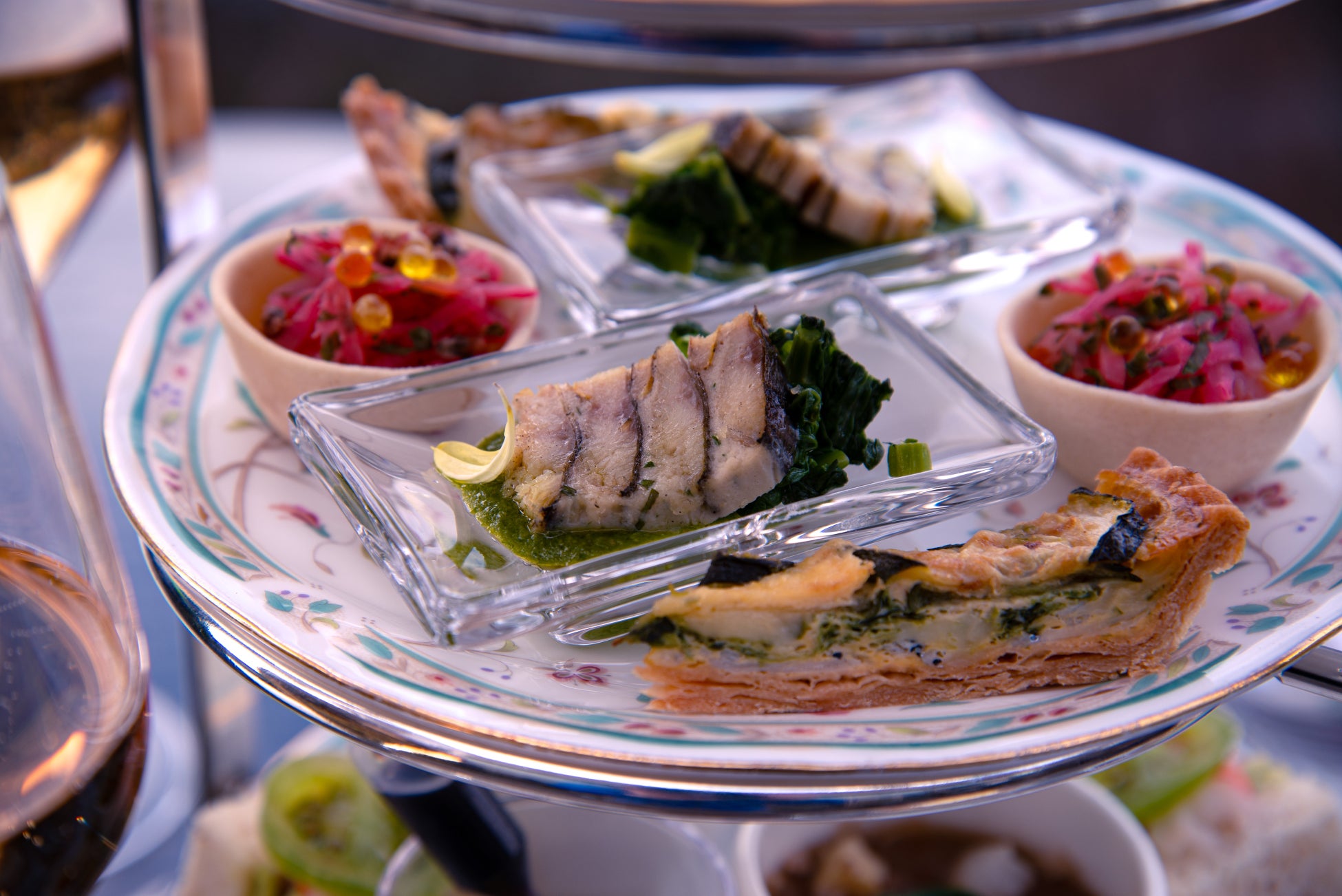 庭園の緑に囲まれたガーデンテラスで、夕暮れのやわらかな光とそよぐ風を感じながら“泡”を心ゆくまでお楽しみいただけます。シャンパン2種とロゼスパークリングワイン1種の飲み比べに加え、3段のオードブルスタンドとデザートをご提供いたします。
