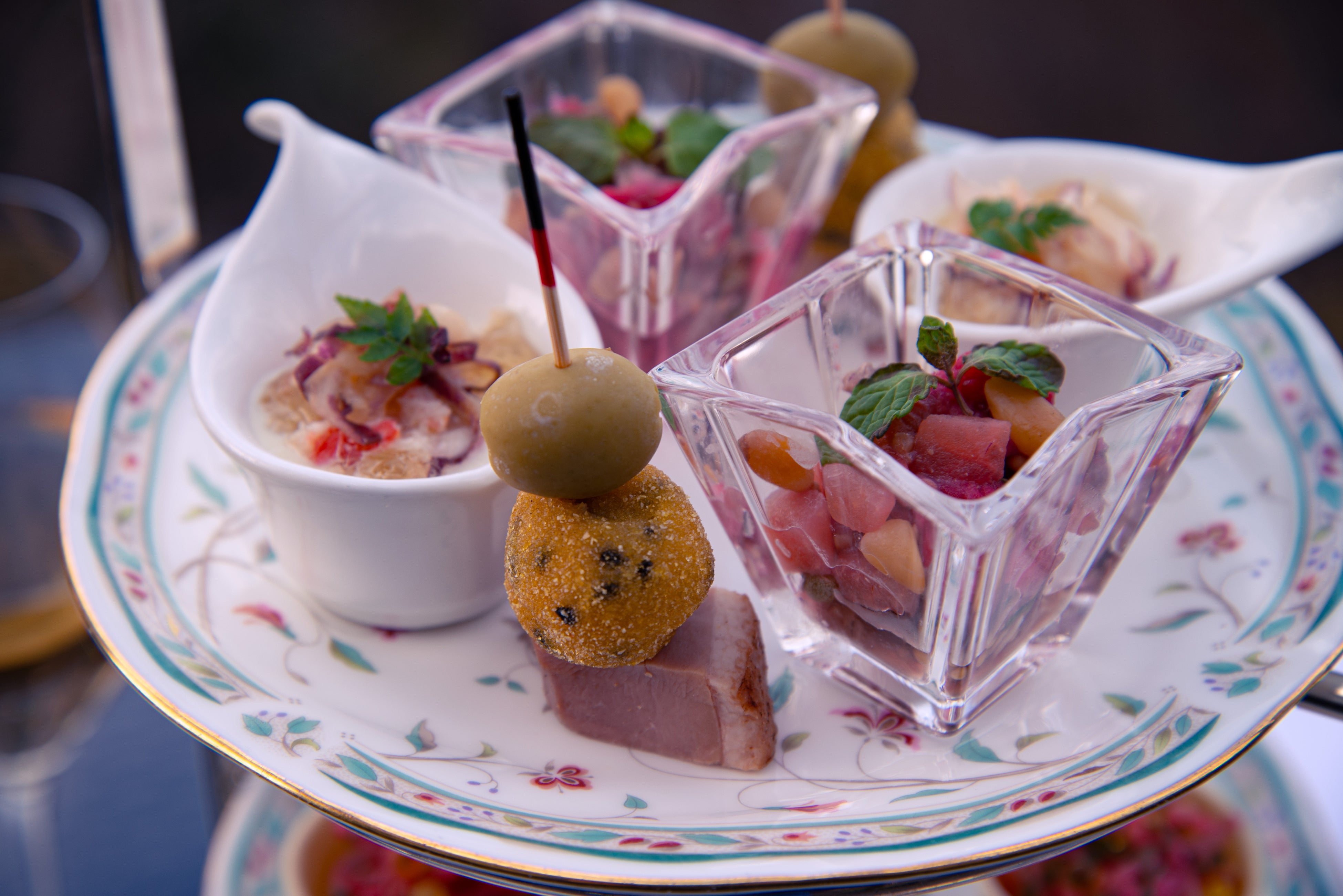 庭園の木々や花々のように、季節ごとに表情を変えるオードブルスタンドのお料理。5月~6月末には、「ずわい蟹と白アスパラガスのピュレ」や「鮎のミルフィーユ ルッコラソース」など、初夏の爽やかさを感じるメニューをご用意します。7月〜8月中旬には「焼き茄子とアンチョビのクロスティーニ」や「真蛸の炙り フェンネルコンフィ」など、旬の食材を活かした料理が登場。訪れるたびに新しい味わいをお楽しみいただけます。
