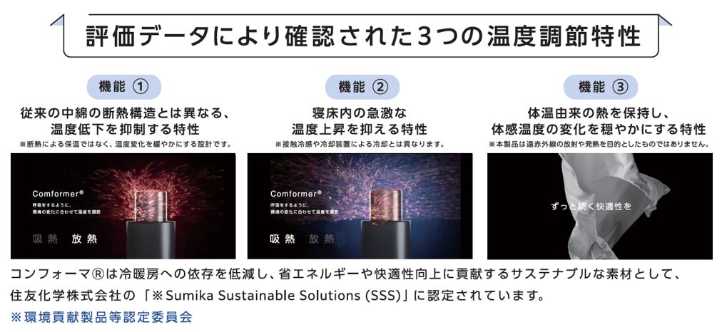 これらの課題に対する答えが、中綿に使用されている住友化学の次世代調温素材「コンフォーマ®」です。従来の温度調節素材は、特定の温度で吸熱または放熱のどちらか一方向に働くものが主流でしたが、コンフォーマ®は「寝床内の温度変動幅を小さく保つ」という、これまでにない温度緩衝型の特性を持っています。