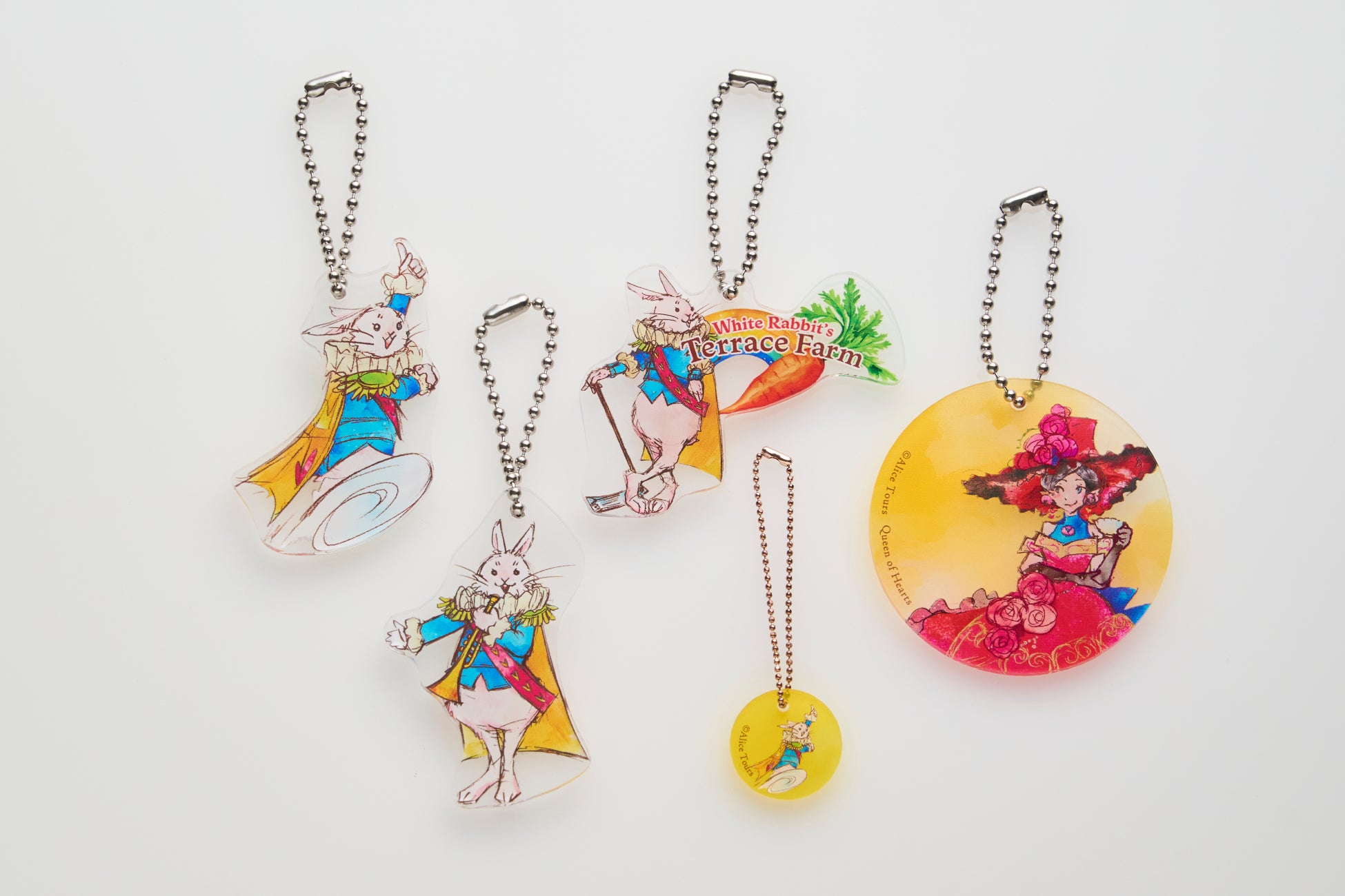 シーズンを重ねる度にキャラクターが増えていくアリスツアーズの関連商品。今回はハートの女王と白うさぎの新デザインが4種類登場します。ミュージアムや水族館などのショップで人気を博すアクリルブランド「toumei」とアリスツアーズのコラボレーション商品は、京成バラ園内のポップアップストア「ディーとダムのアップルカンパニー」のみで購入出来るご当地アイテムです。