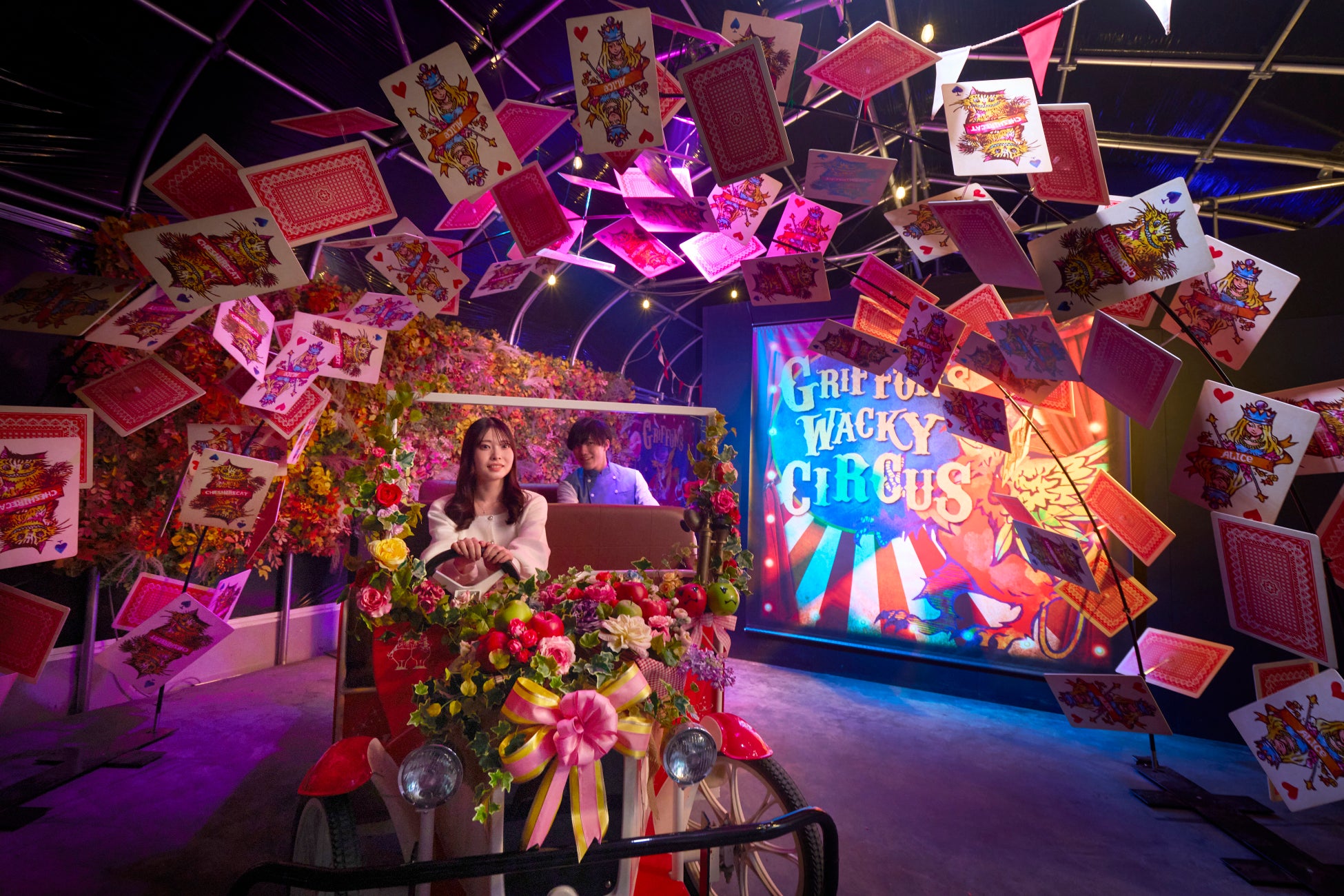 京成バラ園初の自走式ライド系アトラクションとしてデビューした、大人気アトラクションの「アリスツアーズ」が今春も再びオープンします。ゲストはドライバーのエスコートを受けながら、ビークル(電動式の足漕ぎ4輪)に乗り「12分間の森の探検」へ出発します。マッドハッターが準備している「森のお茶会」を見学していると、ビークルにかかってきた一本の電話をきっかけに一行は予期せぬハチャメチャな冒険へと巻き込まれてしまいます。霧のトンネルや、ドライバーの機転で始まるウォーターガンエリアでのミッション、巨大ドラゴンとの鉢合わせ、ドラゴンへの餌やり体験など、スリルと可愛らしさが満載です。「不思議の国のアリス」を原作にしたオリジナルストーリーで、キャラクターからの電話、デジタルグラフィックによるキャラクターの登場、立体的造形など、様々なキャラクター達と出会うことが出来ます。