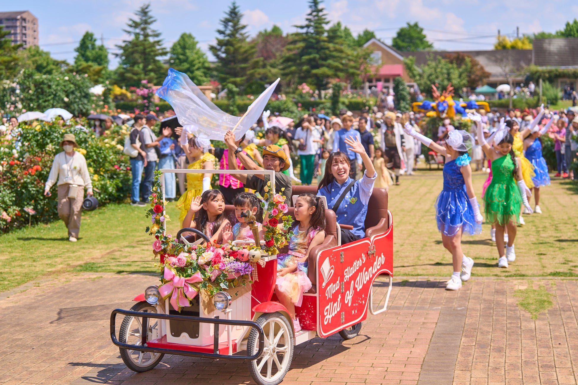 キャラクター、ダンサー、マーチングバンドによるバラのテーマパーク、オリジナルパレード