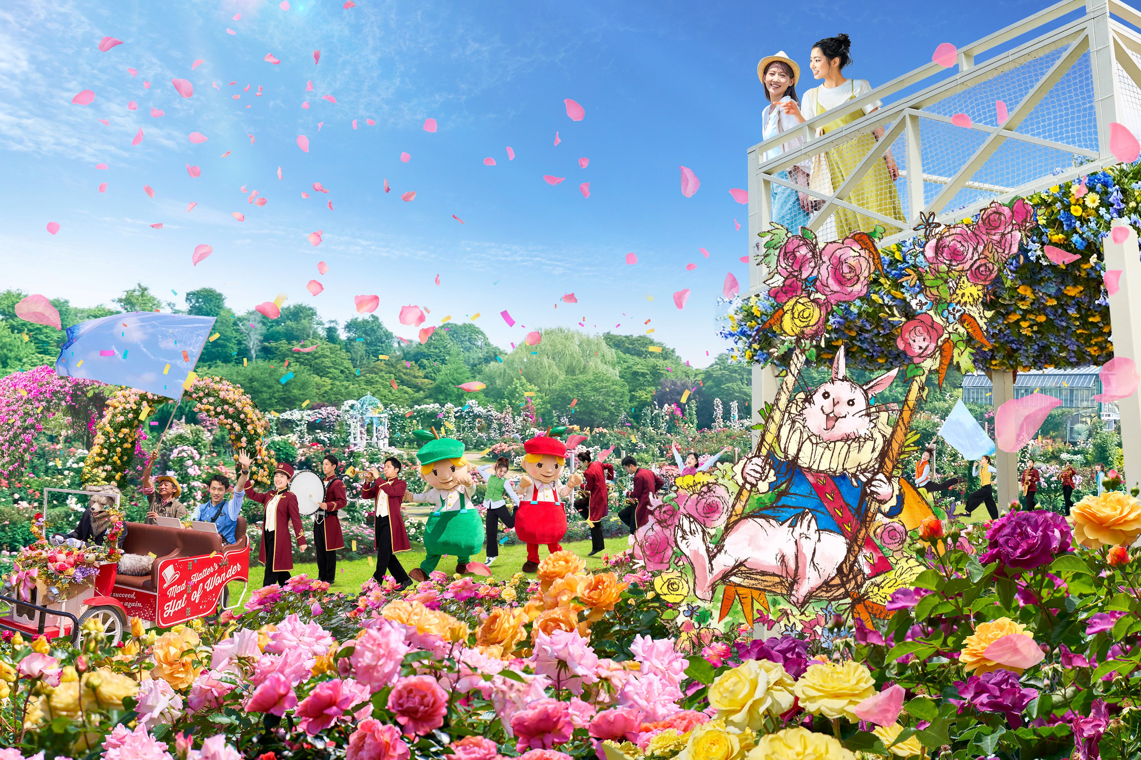 キャラクター、ダンサー、マーチングバンドによるバラのテーマパーク、オリジナルパレード