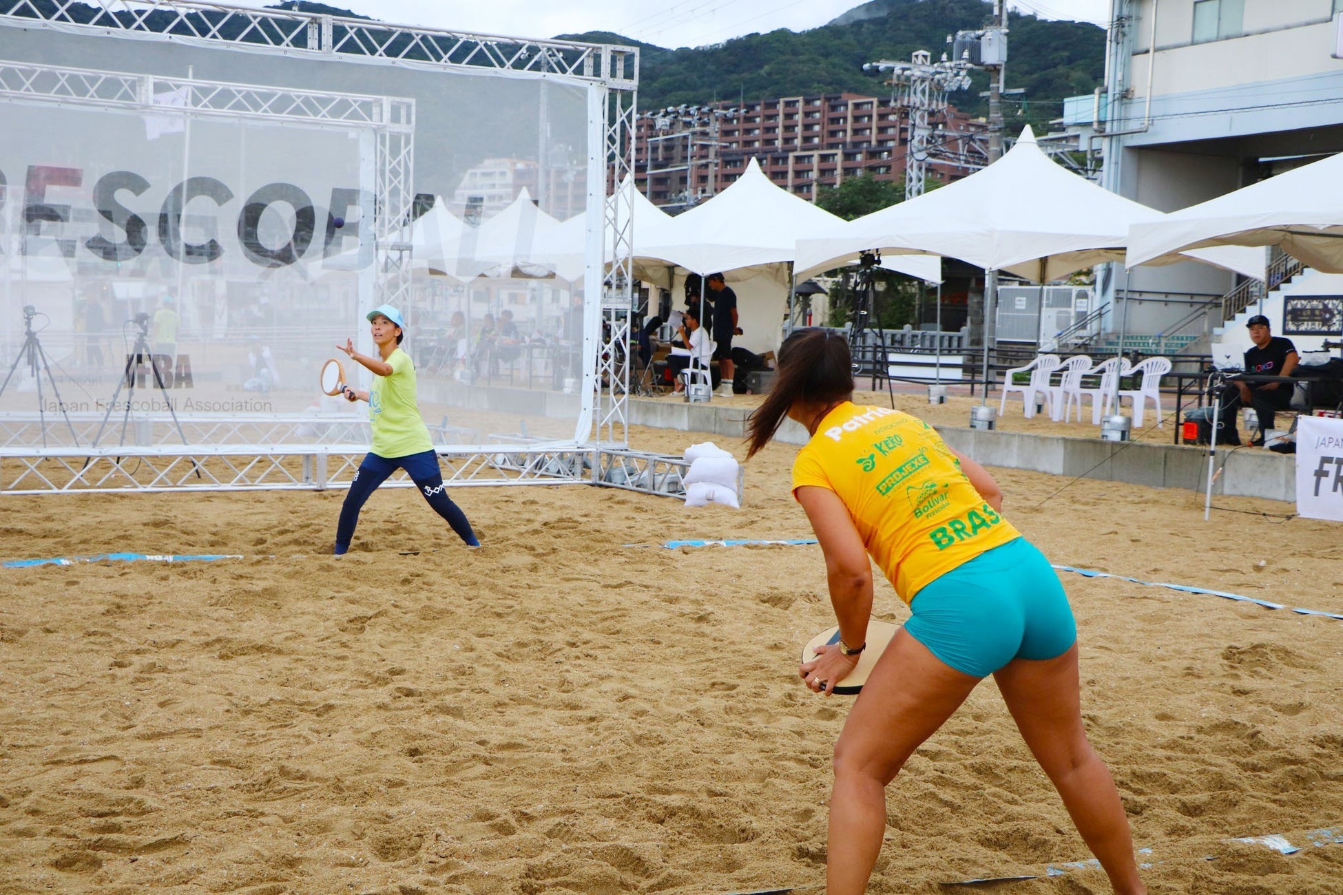 フレスコボールは、ブラジルのリオデジャネイロ発祥のビーチスポーツです。1945年にリオ・デ・ジャネイロのコパカバーナビーチで考案され、現在は世界各地のビーチで親しまれるようになっています。フレスコボールの最大の特徴は、向かい合う2人が競い合うのではなく、協力してラリーを続ける採点競技という点。競技時間は5分間、7mの距離を保って試合を行います。協力してラリーを続ける様子から「思いやりのスポーツ」とも言われています。