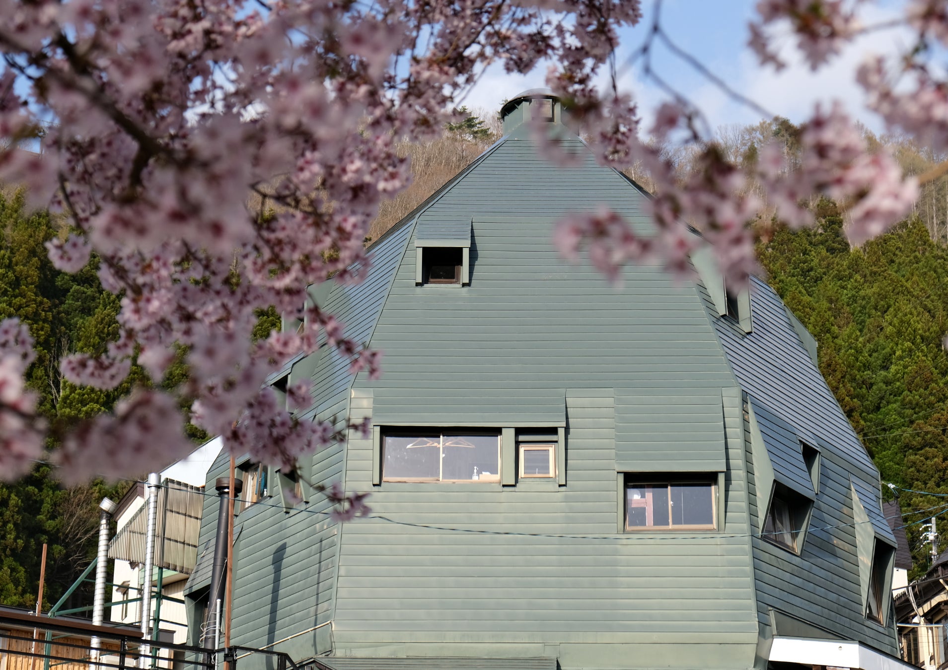 「野沢温泉ロッヂ」は、1969年にル・コルビュジエの薫陶を受けた建築家・吉阪隆正氏が設計した歴史的建造物です。特徴的な緑の屋根とたまご型のドーム建築が目を引き、ゲレンデから徒歩1分の長坂ゴンドラ近くに立地しています。