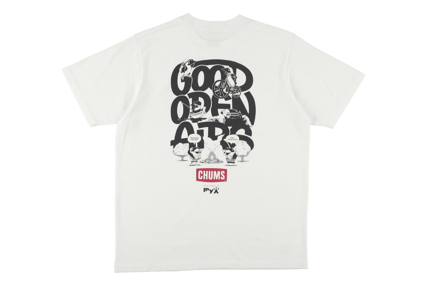 背面にイラストを大きく配し、前面にはGOOD OPEN AIRSとCHUMSのロゴをあしらっています。