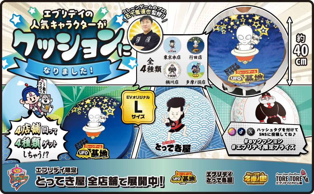 さらに、クレーンゲームのプロ監修のもと、アミューズメント景品として展開していきます。エブリデイにご来店した記念になるこちらのクッションは、思わず写真を撮ってシェアしたくなること間違いなしのオリジナル景品です。