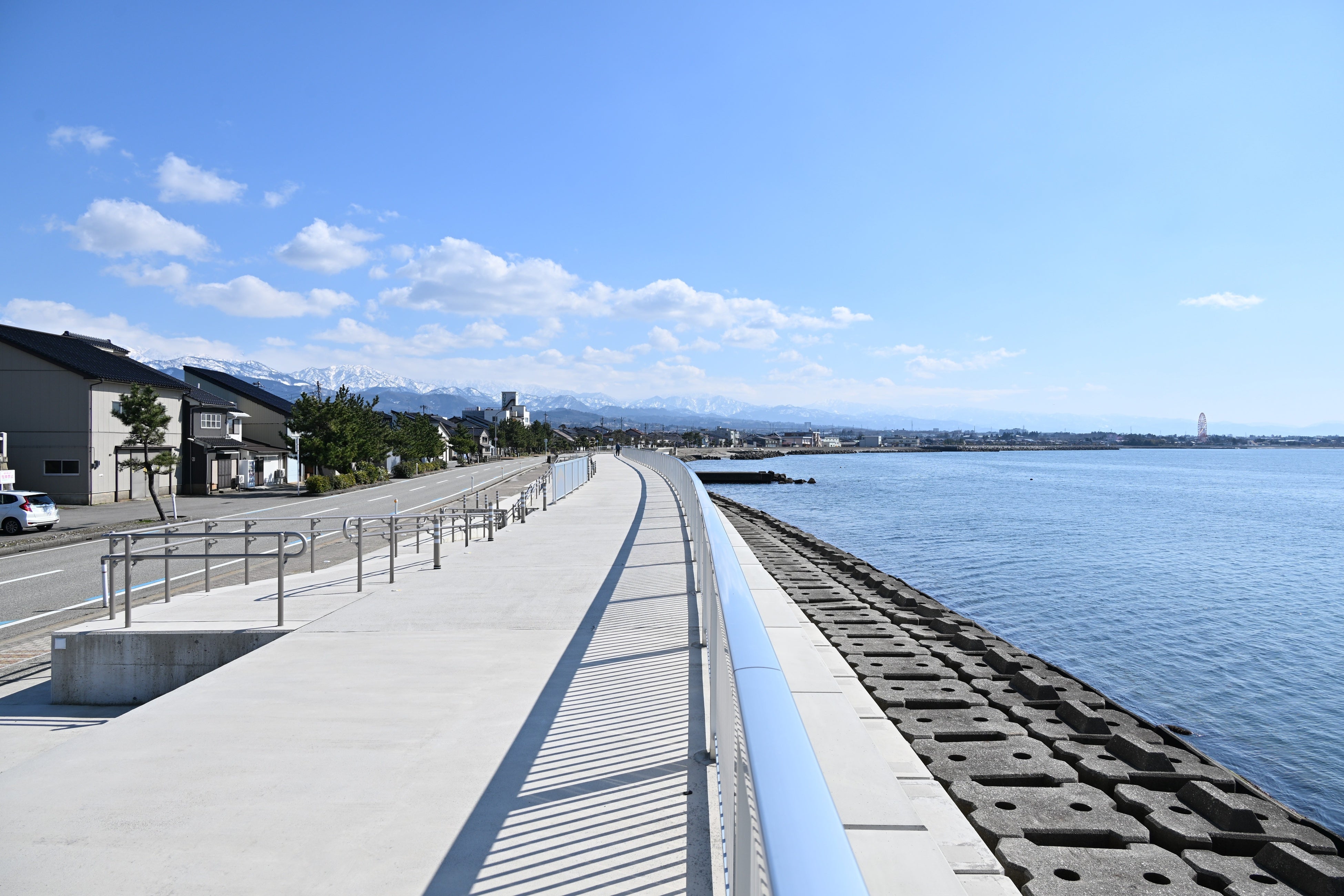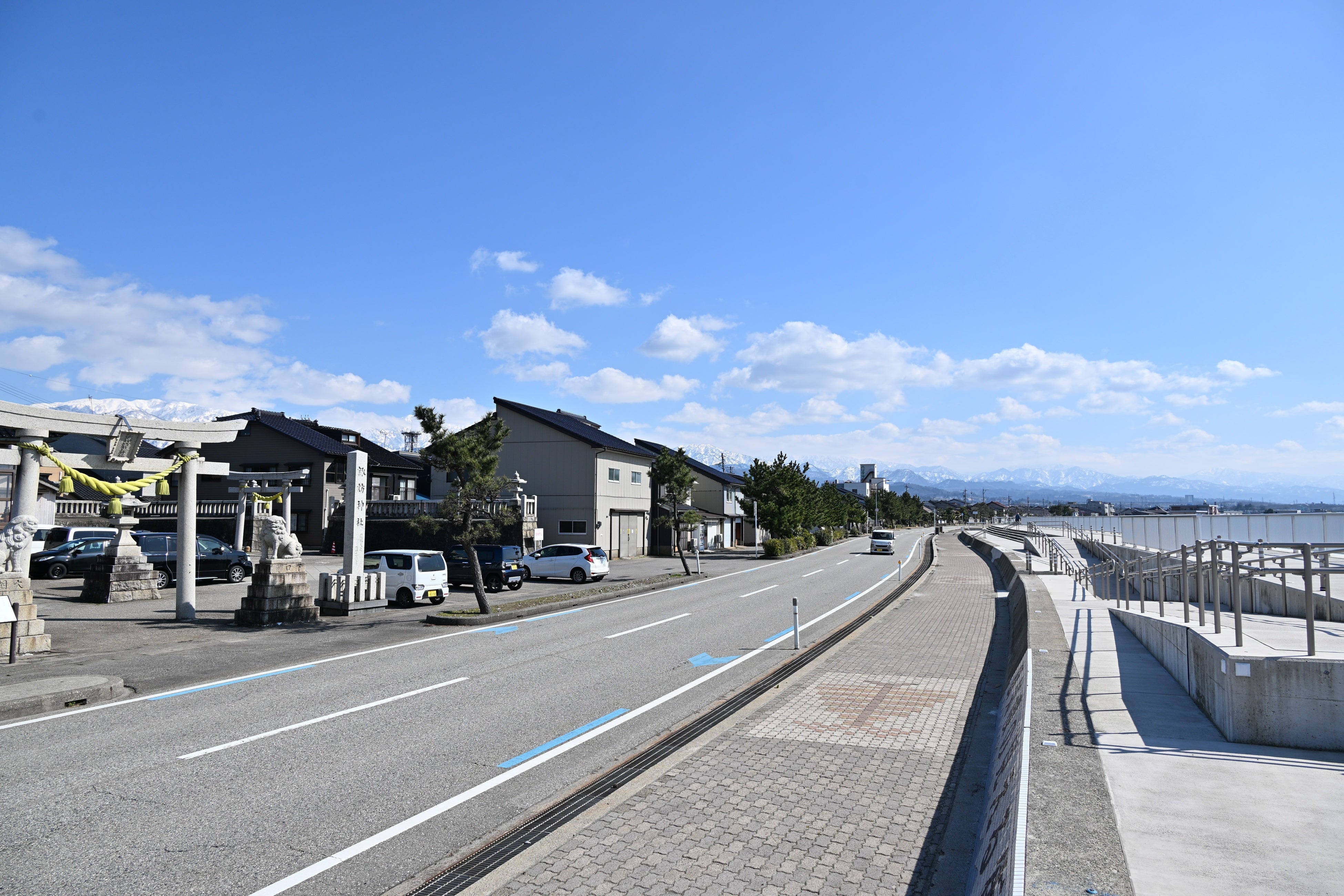 舞台の蜃気楼ロードは、魚津市の海岸線沿いを南北に走る街道です。日本風景街道やナショナルサイクルルートにも登録され、県内で有数のドライブやサイクリング、ジョギングのコースとして親しまれています。対象エリアは海の駅蜃気楼から遊園地・ミラージュランドの区間で、ルート上には魚津水族館や魚津埋没林博物館、蜃気楼展望地点、米騒動発祥の地、魚津港最初の灯台「万灯台」など多くの観光スポットや地域資源、歴史遺構が点在しています。気軽に散策を楽しめる街道です。