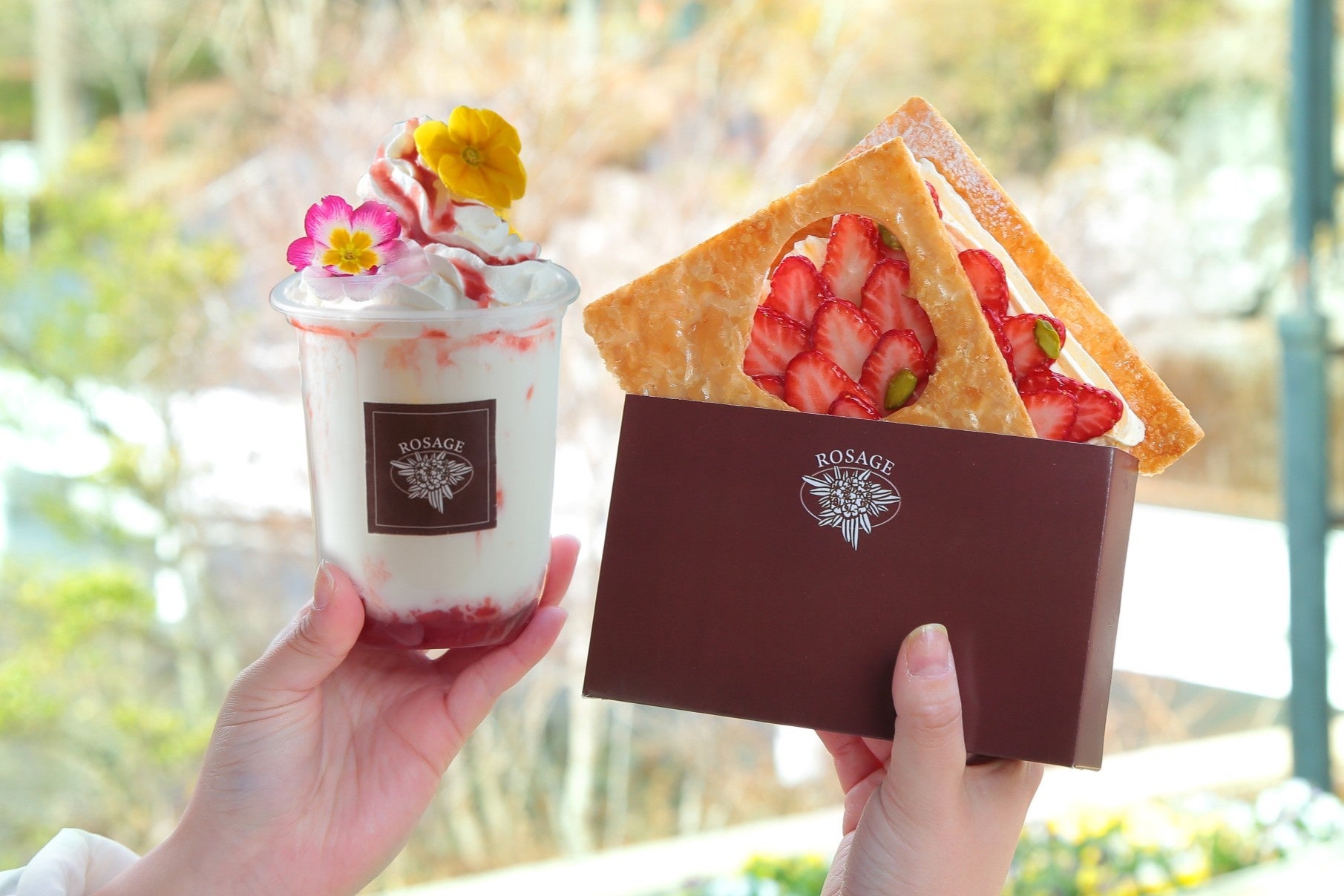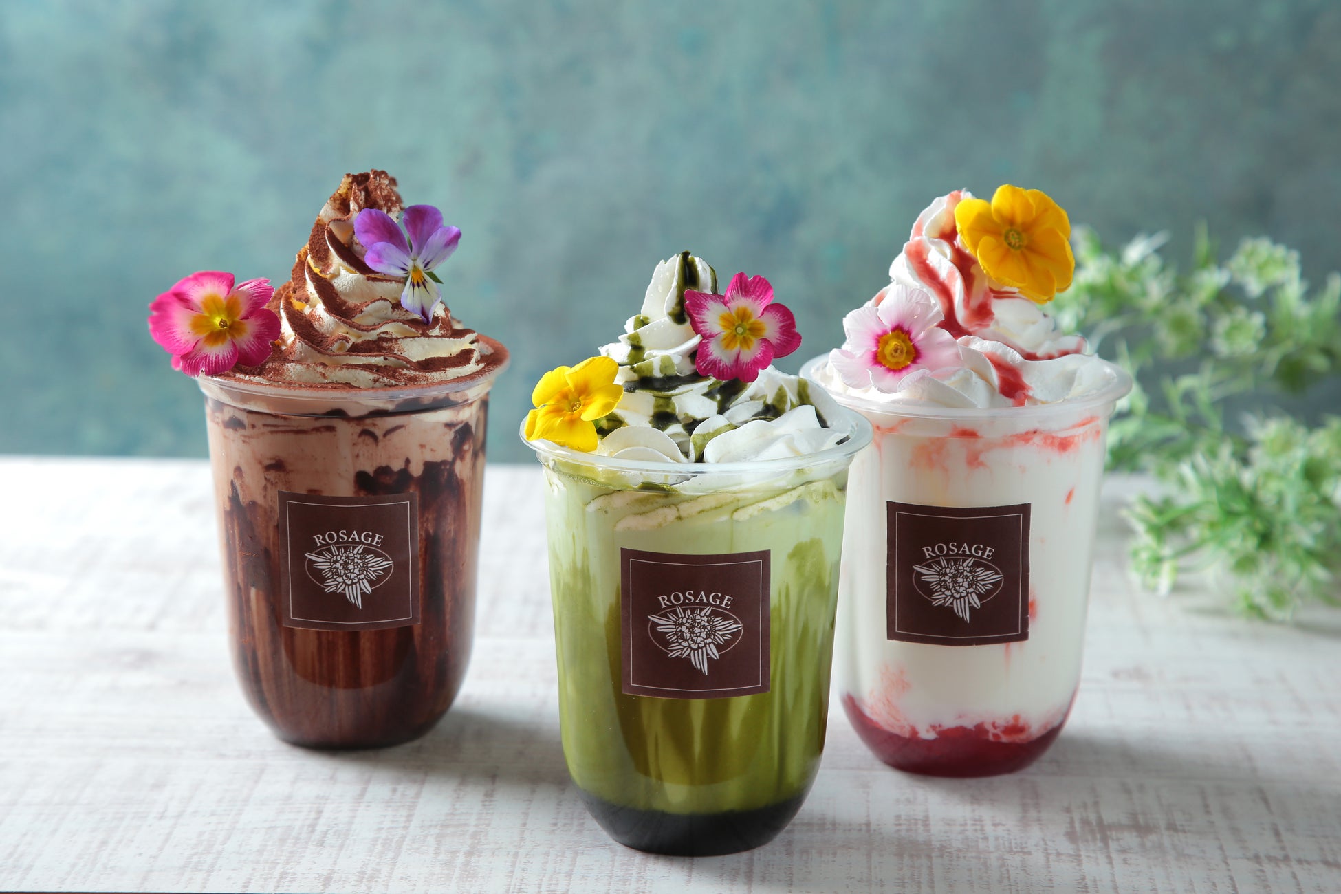 また、お花で可愛らしくデコレーションしたオリジナルドリンクも登場。コーヒー、フルーツ、抹茶といったベースドリンクにミルクを加え、仕上げに濃厚なクリームを絞りエディブルフラワーを華やかに飾った一杯は、ミルフィーユと一緒にテイクアウトして庭園散策のお供に楽しむのもおすすめです。