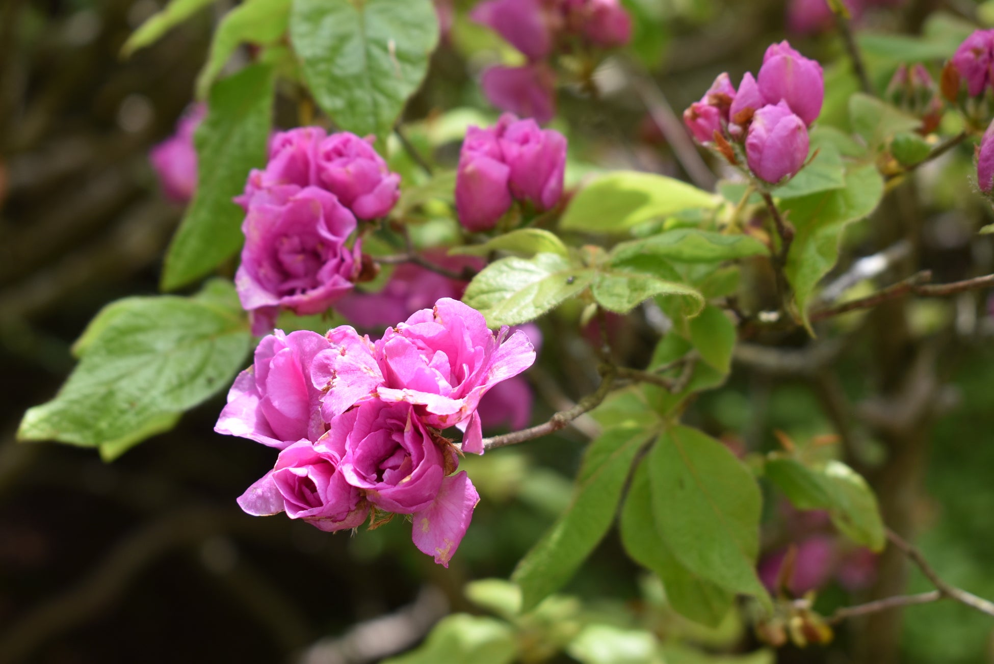 (左)「手牡丹(てぼたん)」 江戸時代の園芸書にも登場するツツジの古品種。紅紫色の八重咲きで、雄しべが花弁に変異した珍しい花姿が特徴。露地植えで残る株は少ない貴重品種で、ホテル庭園で1株のみ見ることができる。