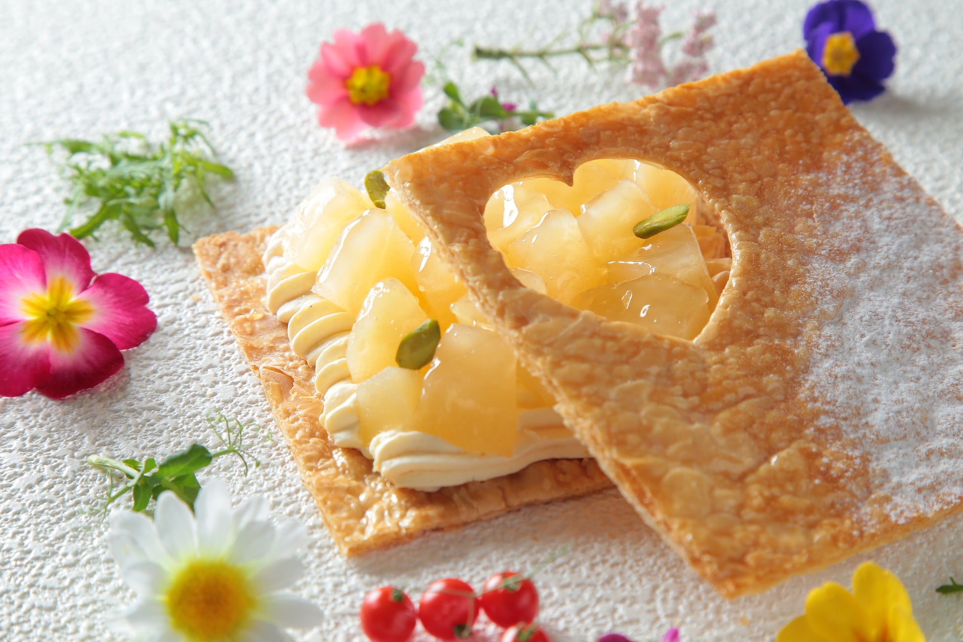 目玉となるのは、フランスの伝統菓子ミルフィーユを現代風にアレンジした、片手で楽しめる新感覚のデザートです。店内で焼き上げるサクサクのパイ生地と、シャキシャキとした食感を活かしたリンゴのコンポートが織りなす、芳醇な香りと味わいをお楽しみいただけます。