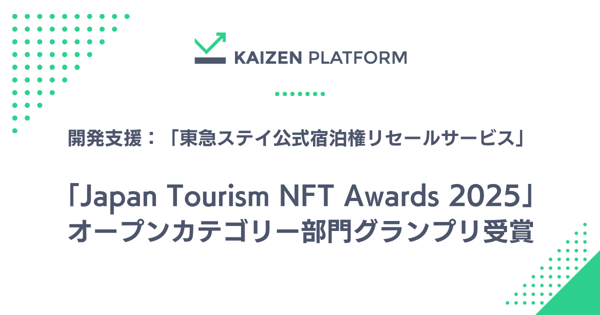 株式会社Kaizen Platform(本社:東京都港区、代表取締役:須藤 憲司、以下「Kaizen Platform」)は、東急不動産株式会社(本社:東京都渋谷区、代表取締役社長:田中 辰明、以下「東急不動産」)、東急リゾーツ&ステイ株式会社(本社:東京都渋谷区、代表取締役社長:山脇 賢一、以下「東急リゾーツ&ステイ」)、株式会社POCKET RD(本社:東京都港区、代表取締役:籾倉 宏哉、以下「POCKET RD」)と共に開発を推進した、NFTを活用した宿泊権利プラットフォーム「東急ステイ公式宿泊権リセールサービス」が、一般社団法人日本Web3ツーリズム協会が主催する「Japan Tourism NFT Awards 2025」オープンカテゴリー部門においてグランプリを受賞したことをお知らせします。