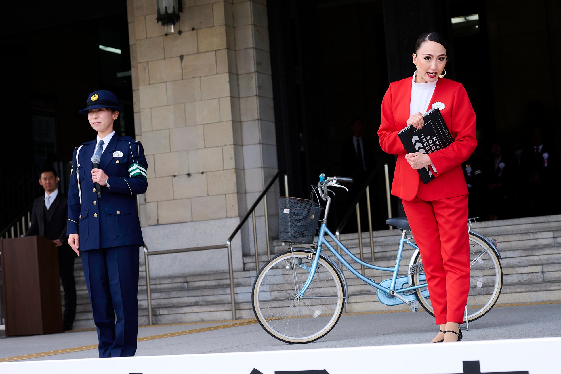 特別ゲストとして招かれた「綾小路麗華」は、まず今春から交通反則通告制度が適用される自転車の交通安全について「自転車の交通違反をなくすため、乗る方も乗らない方もルールを必ず知っておくこと!」と 府民の皆さまへ向けて呼びかけました。また、ドライバーだけでなく、歩行者に向けて「道路をわたるときは横断歩道を利用すること!」「歩きスマホは事故の原因になるからダメ!」、そして「(路上横臥による事故が増加していることに対して)道路で寝ないようにしなさい!」とメッセージを送りました。