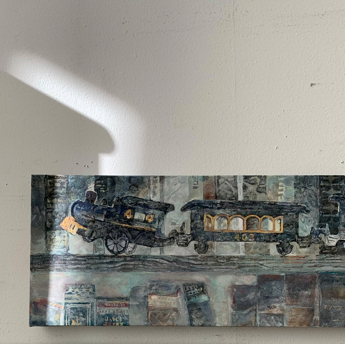 齋藤は岩絵具を用いて絵画制作を行います。鉱石を砕いてつくられた粒子状の絵具は、その色合いや質感が独特であり目を惹きます。日常の機微を描き留めていくなかで、改めて「乗り物」とは魅力的な造形であると考え、本展示ではモチーフを乗り物に絞り作品を
