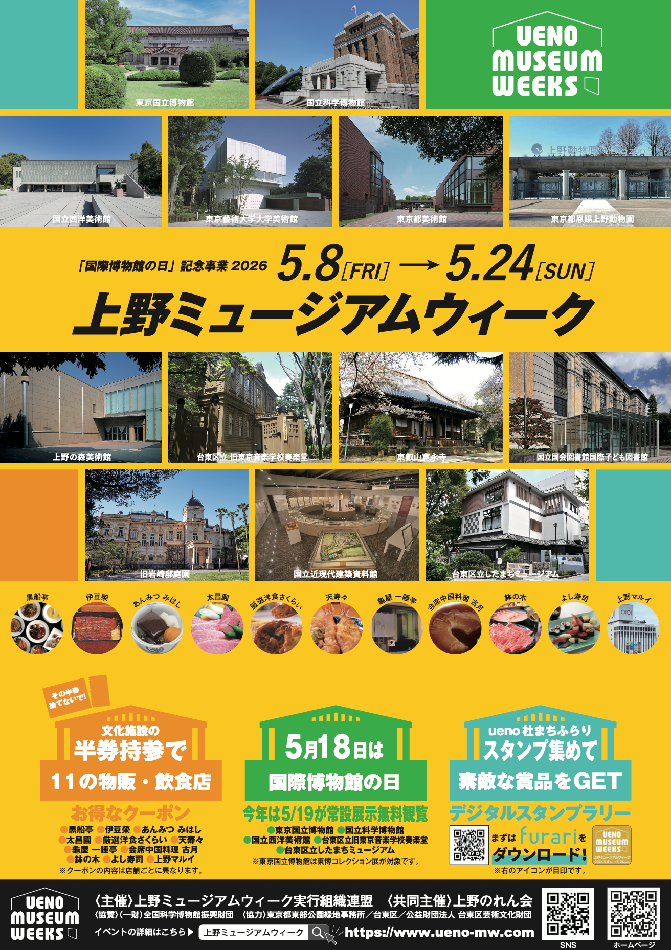 上野エリアでは、5月18日の “国際博物館の日” にちなみ、上野恩賜公園周辺にある博物館や美術館、動物園など 13 施設と、上野のれん会の加盟店が協力し、「上野ミュージアムウィーク」が開催されます。今年も昨年に続き大好評でしたデジタルスタンプラリーが継続して行われ、まちでも多くの展覧会が開催されるなどより一層魅力的なスペシャルウィークとなります。毎年恒例の “まちのお楽しみ” クーポンと合わせ、上野全体が文化のドキドキワクワクに満ち溢れたテーマパークになる特別な時間、ぜひフルにお楽しみください。