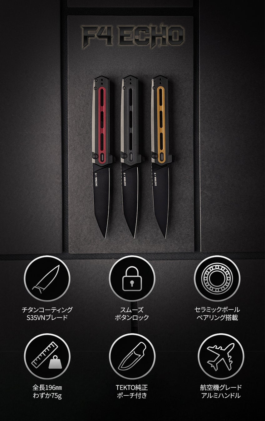 両者の哲学が交わる「F4 ECHO」には、Zastava製ライフルのクラシックな銃床からインスパイアされた3つのG10インレイが配置され、ポケットクリップにはZastava × TEKTOのダブルネームロゴが精緻に刻印されています。所有する喜びと、道具としての信頼性が一体になった逸品です。