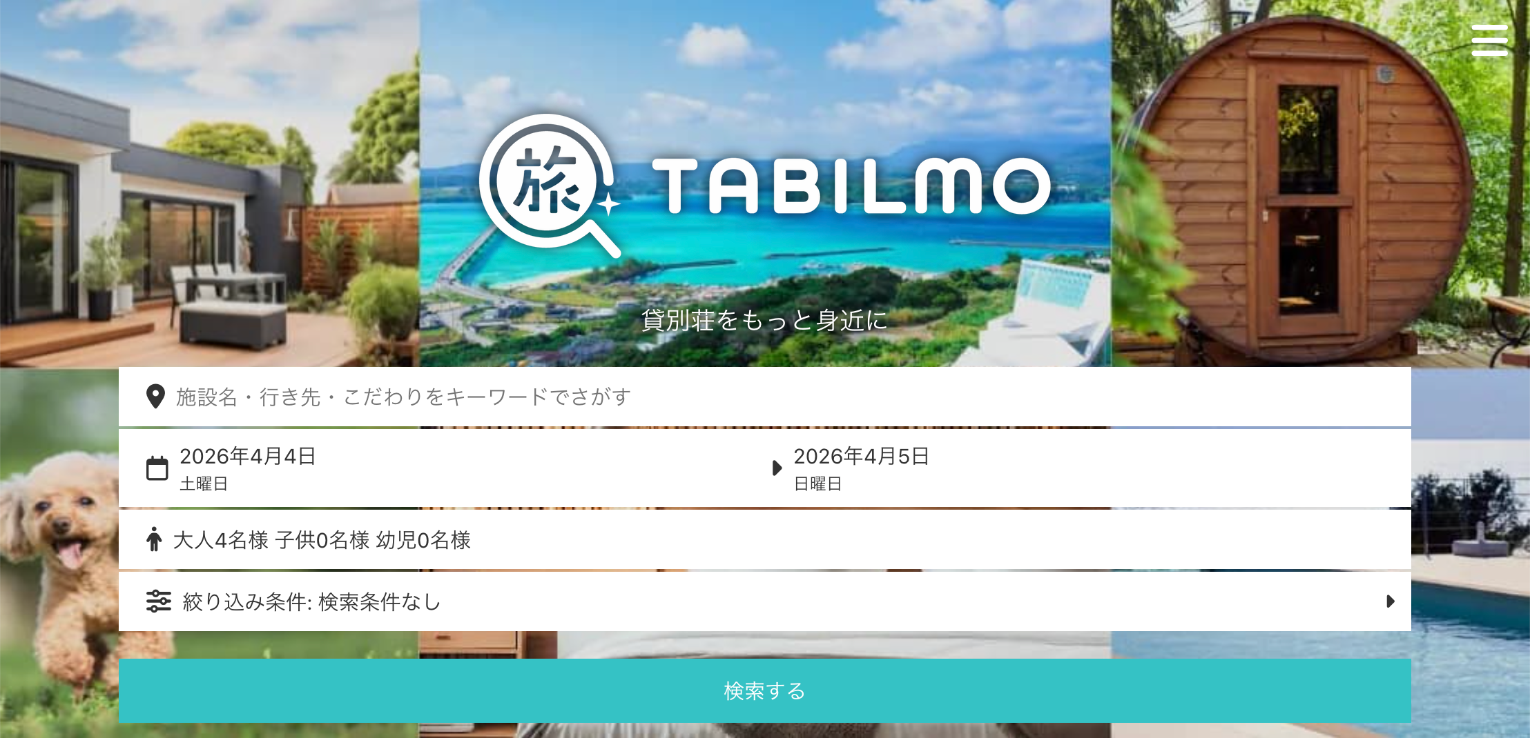 TABILMO(タビルモ)は、コテージ・貸別荘・民泊などの一棟貸し専門の予約サイトです。「ペット化」「サウナ付き」といった大手サイトでは埋もれがちな細かい条件検索のほか、複数家族や合宿などの大人数予約に強みを持ち、施設の個性を活かした集客が可能です。