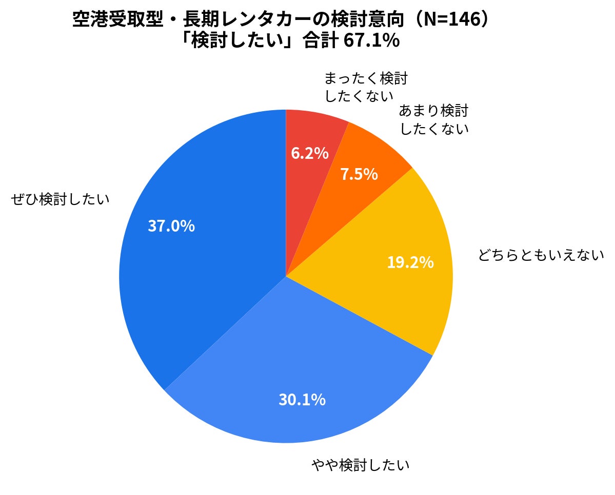 空港で受け取り、滞在中ずっと利用でき、空港や自宅・駅で返却できる長期レンタカーがあれば検討しますか?」と尋ねたところ、「ぜひ検討したい」(37.0%)と「やや検討したい」(30.1%)を合わせて67.1%が検討意向を示しました。