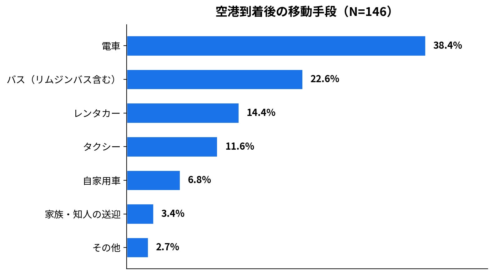 空港到着後の移動手段は「電車」が38.4%で最多。次いで「バス(リムジンバス含む)」が22.6%、「レンタカー」が14.4%、「タクシー」が11.6%と続きます。