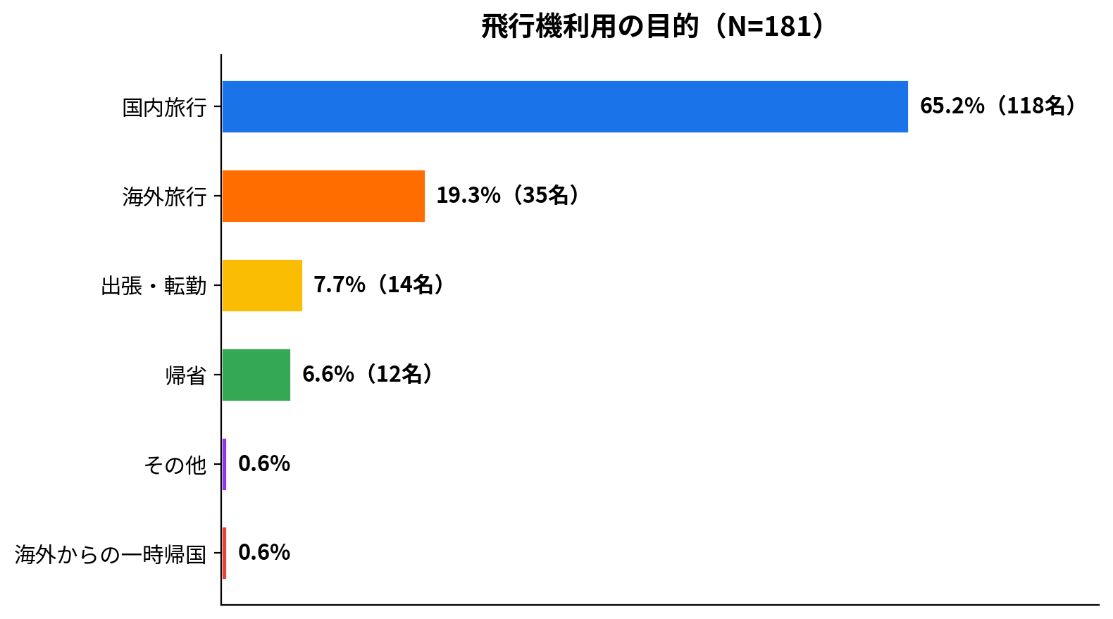 飛行機利用経験者181名に利用目的を尋ねたところ、「国内旅行」が65.2%で最多、次いで「海外旅行」が19.3%、「出張・転勤」が7.7%、「帰省」が6.6%でした。