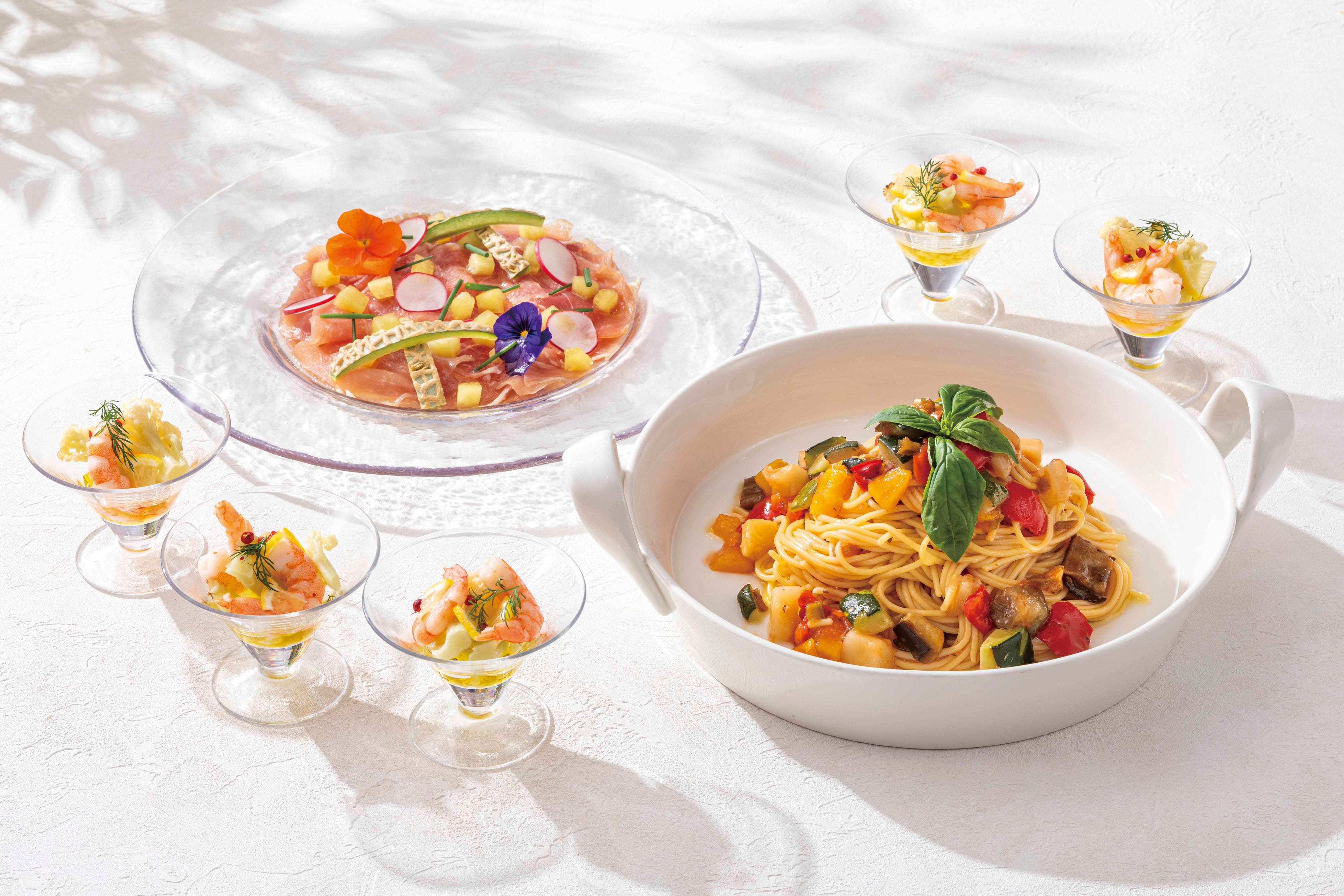 セイボリーには、ジンジャーソースで味わう「ローストポーク」や、「生ハムとメロンのオードブル」、「小海老のレモンマリネ」など、初夏にぴったりの爽やかな味わいをご用意。さらに彩り豊かな夏野菜をトマトの酸味で軽やかに仕上げた「夏野菜のスパゲッティポモドーロ」など、季節感あふれるメニューもお楽しみいただけます。
