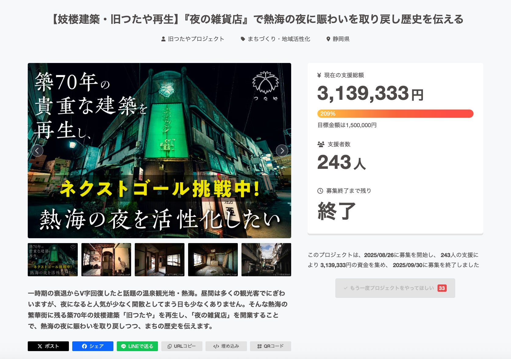 2025年8月には、雑貨店『ヨルノアタミ』開業に向けて、『妓楼建築・旧つたや再生】『夜の雑貨店』で熱海の夜に賑わいを取り戻し歴史を伝える』と題して、CAMPFIREにてクラウドファンディングをスタート。3日目に目標額の150万円を達成し、最終的に250人近い方から合計3,139,333円の支援をいただき、1階スペースの改装・改修を行いました。